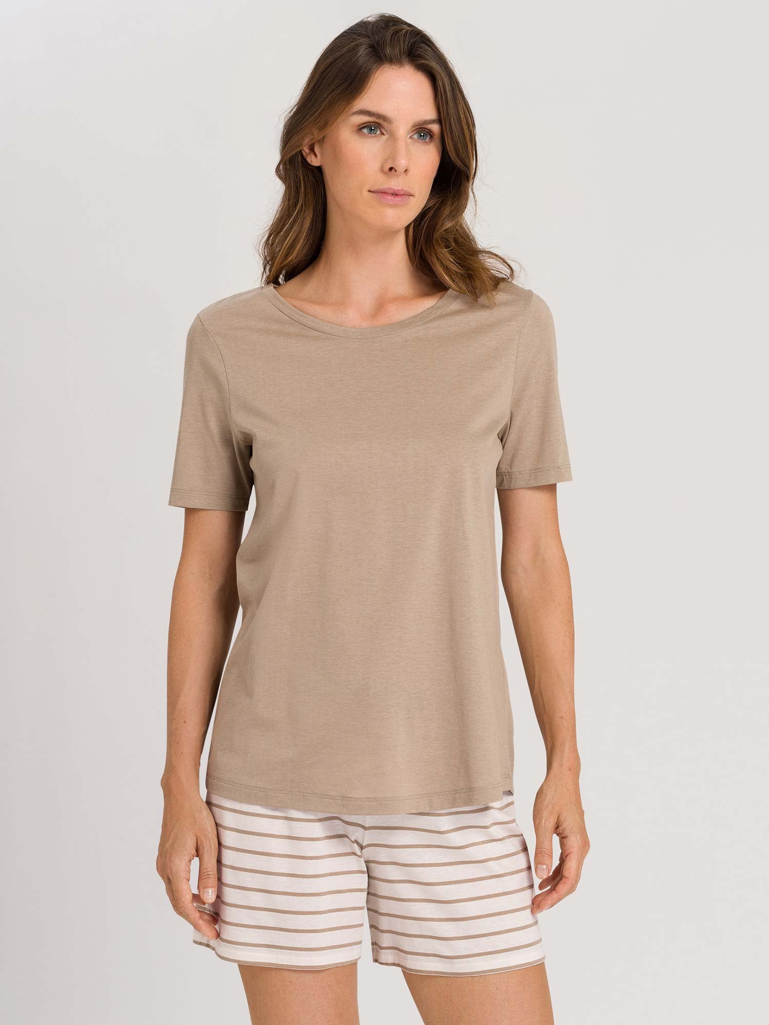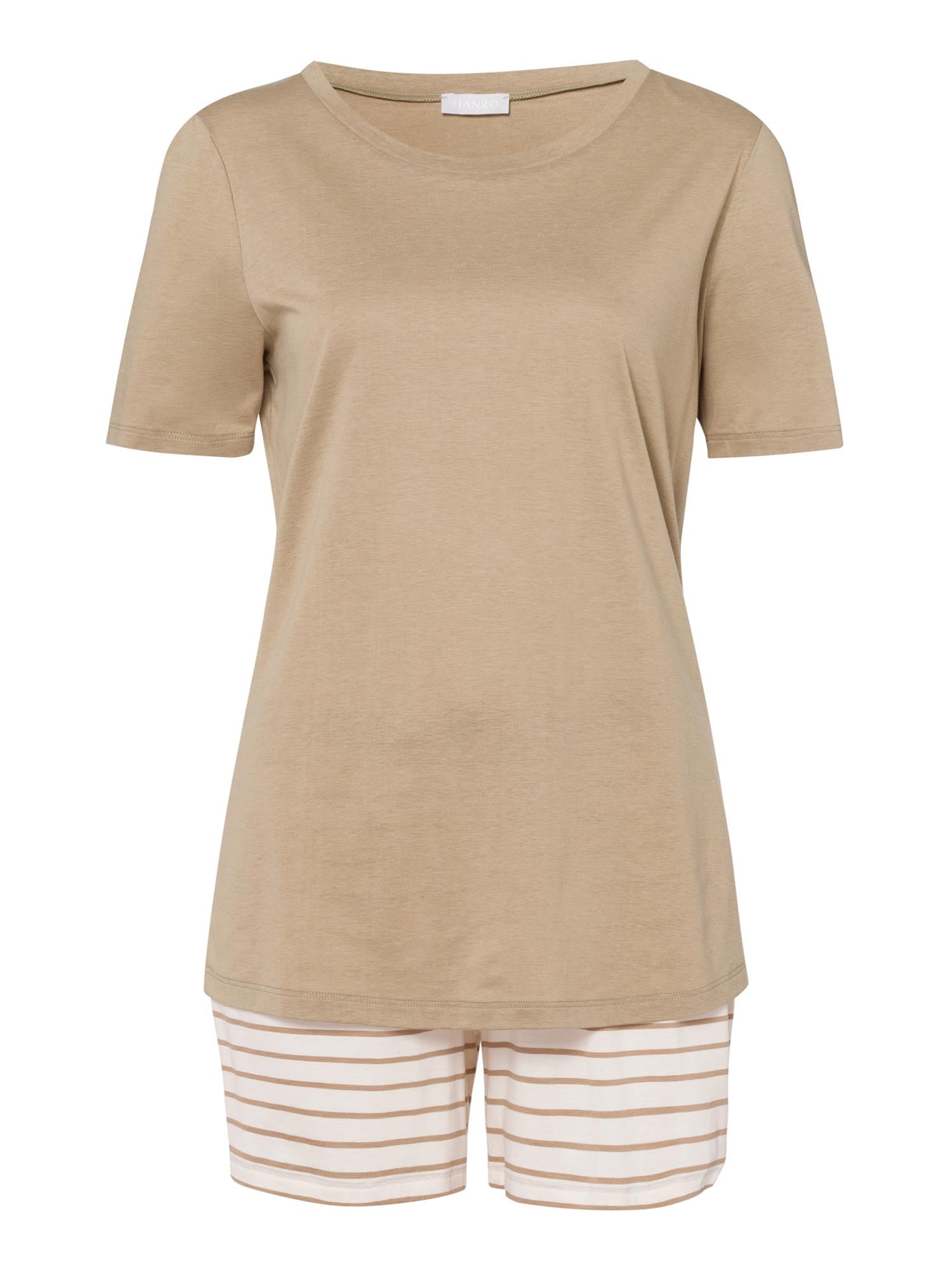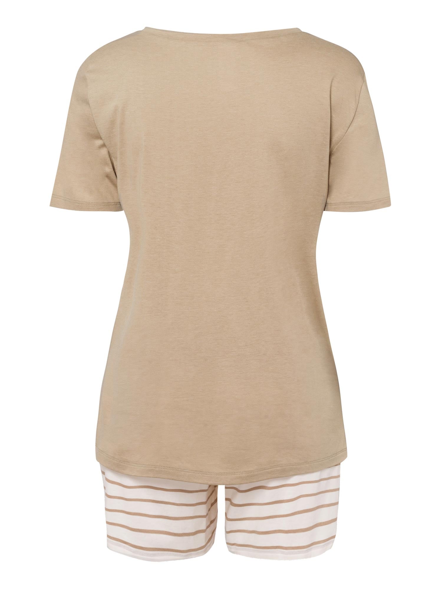 بيجامة مريحة من خليط القطن والمودال الناعم. الجزء العلوي البيج مع خط رقبة مستدير. السروال بنمط خطوط حلقية وحافة حزام خصر مطاطي مع حبل شد.