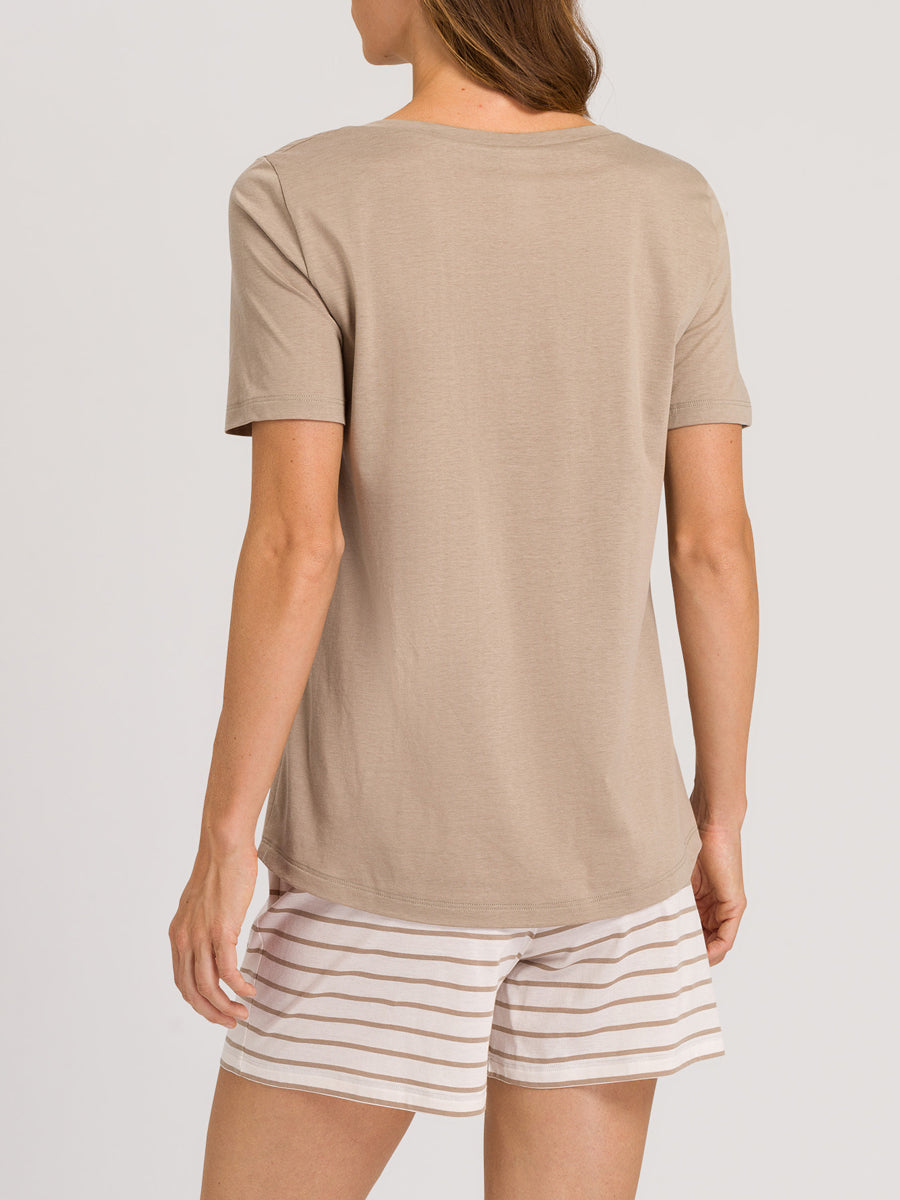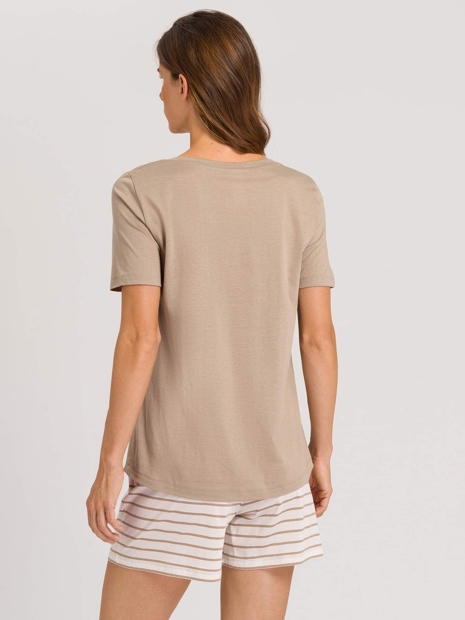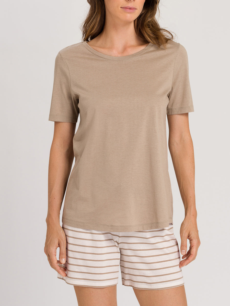 بيجامة مريحة من خليط القطن والمودال الناعم. الجزء العلوي البيج مع خط رقبة مستدير. السروال بنمط خطوط حلقية وحافة حزام خصر مطاطي مع حبل شد.