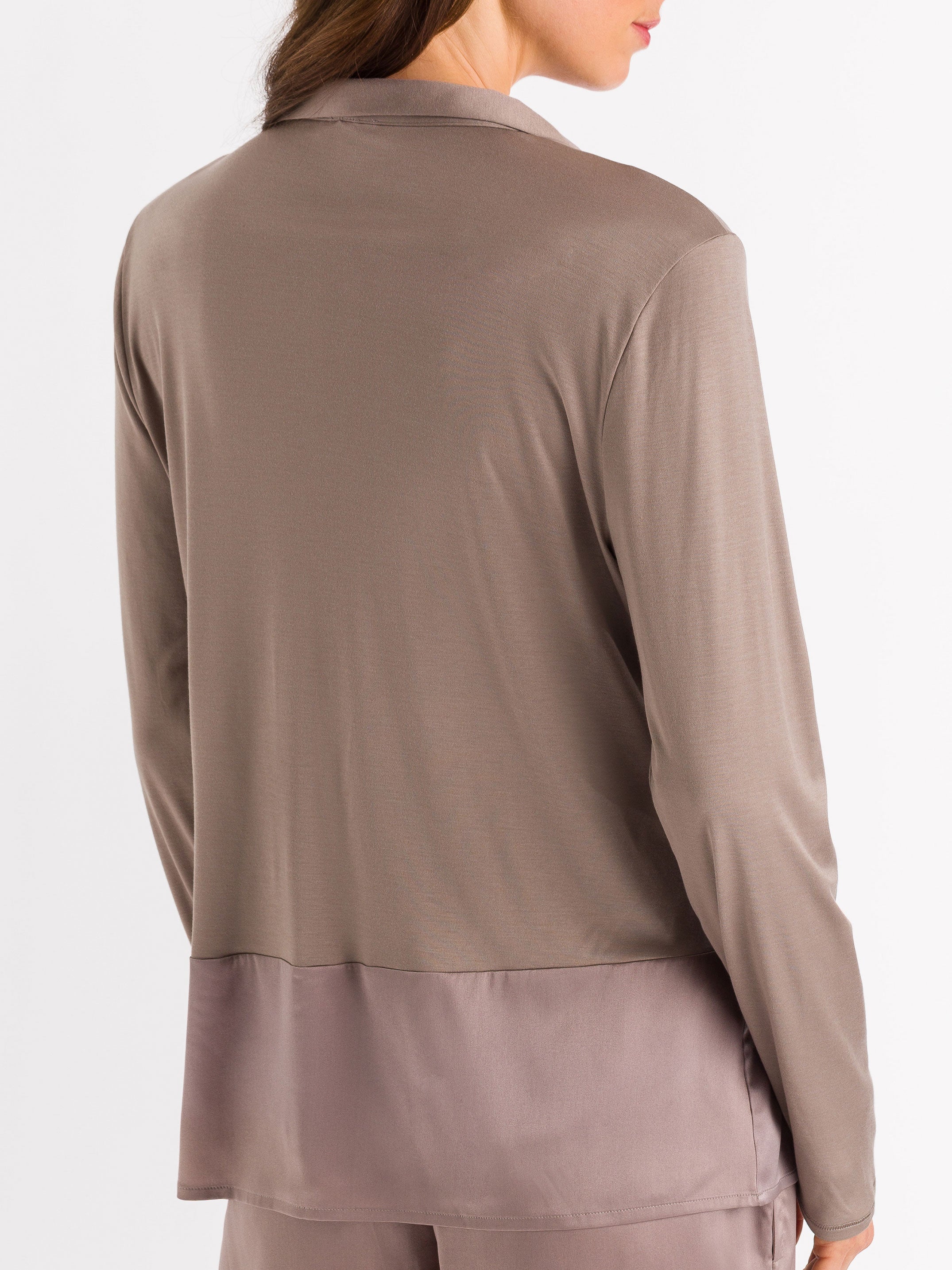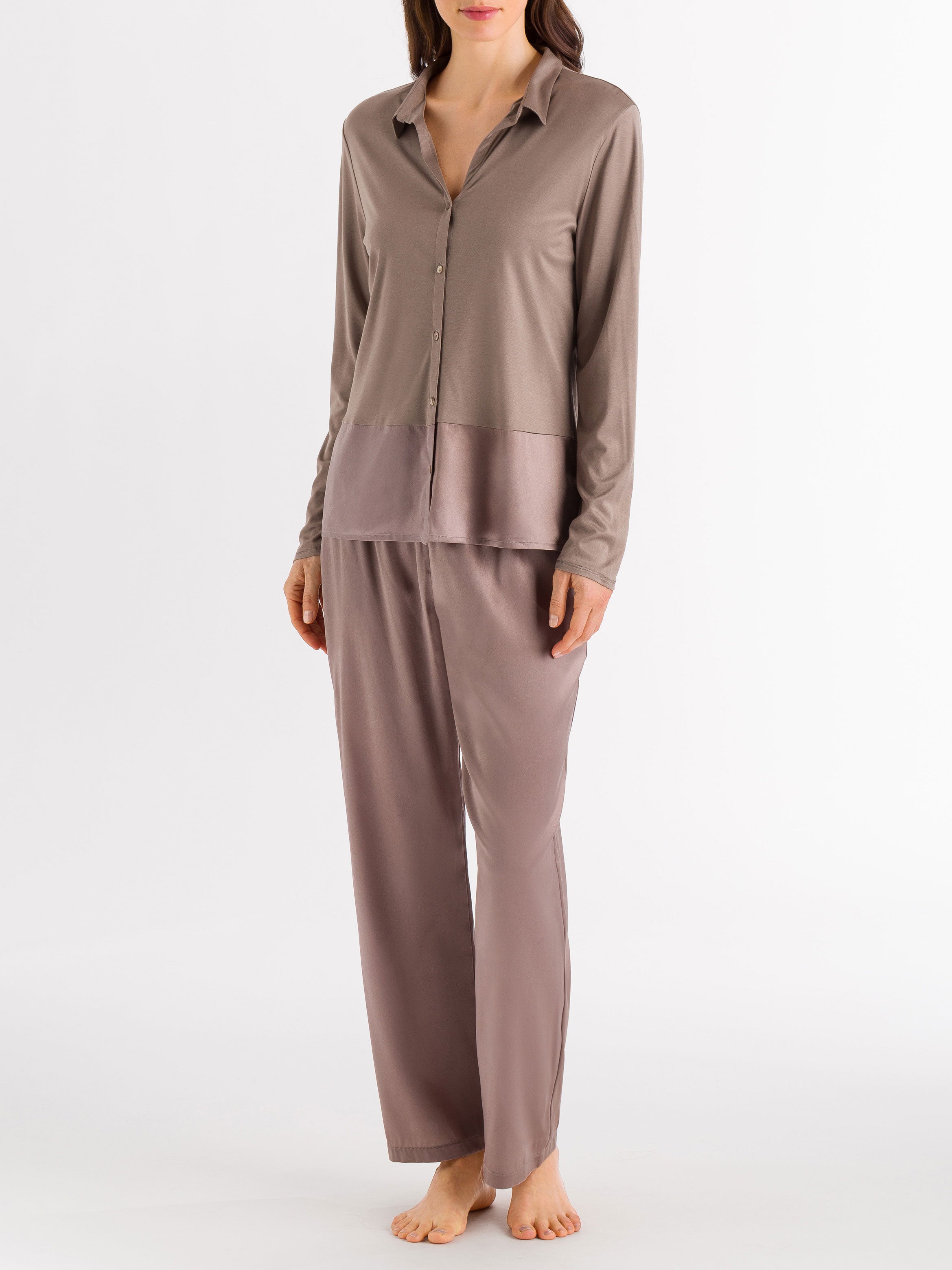 بيجاما فاخرة وناعمة بلون التوب العتيق. الجزء العلوي مصنوع من 85% ميكرومودال و 15% حرير، مع أزرار. الجزء السفلي مصنوع من 94% حرير و 6% إيلاستين، مع حزام مريح وجيبين جانبيين.