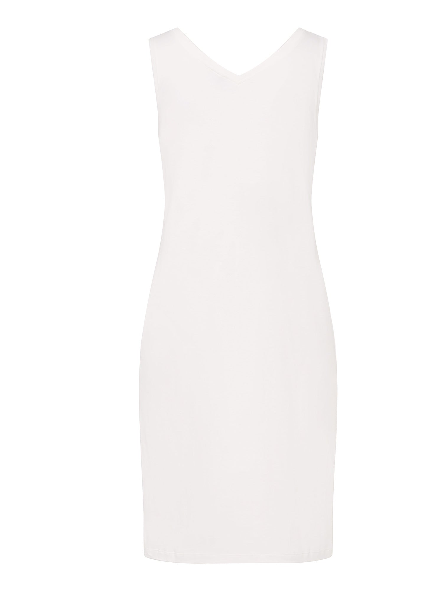 فستان نوم مستقيم بدون أكمام مصنوع من 100% قطن مُمَرْزَر بجودة إنترلوك. مع ياقة على شكل V عميقة من الأمام والخلف وخياطة تقسيم أنيقة على الجانبين. طول يصل إلى الركبة بمقدار 95 سم.