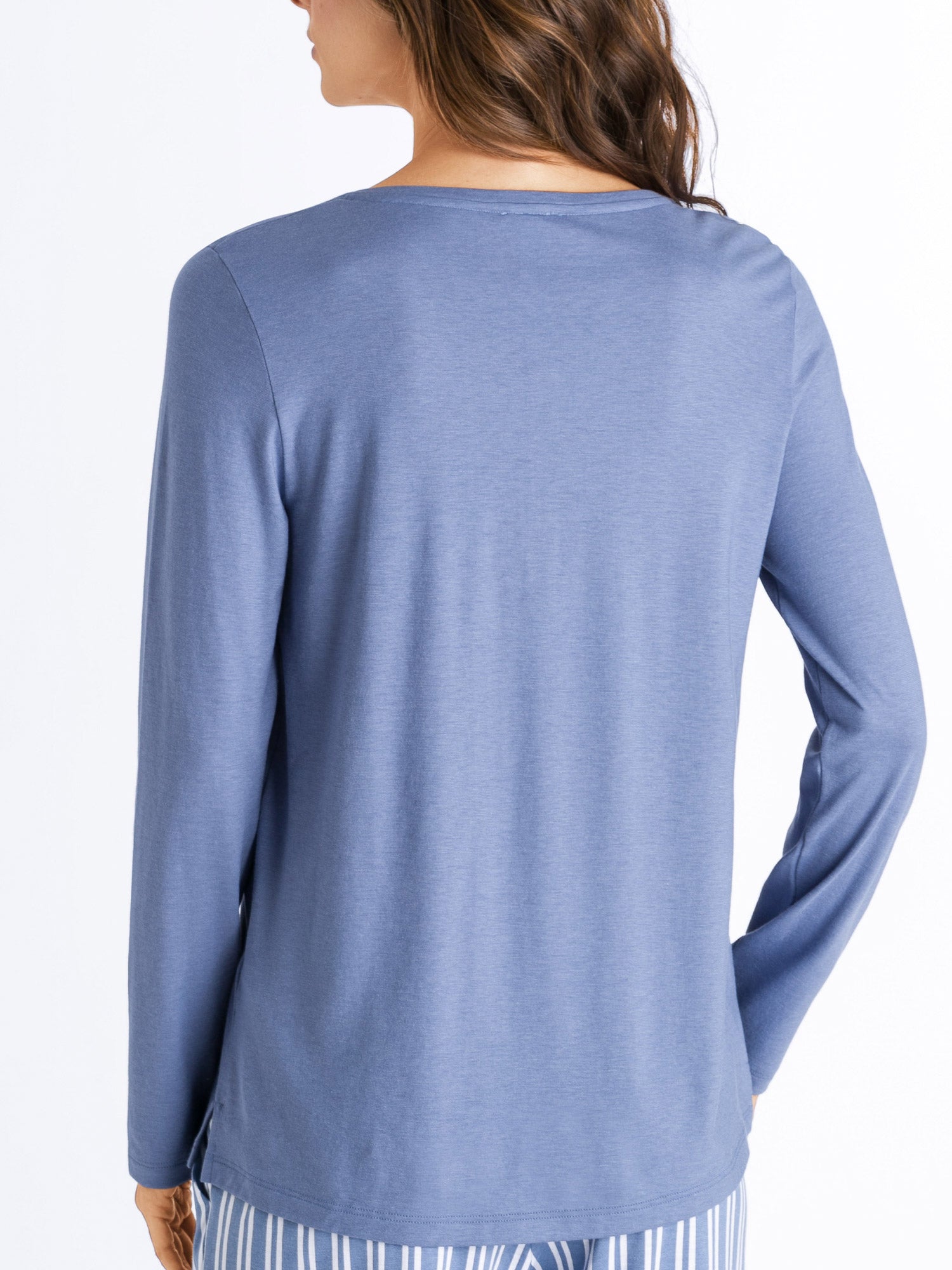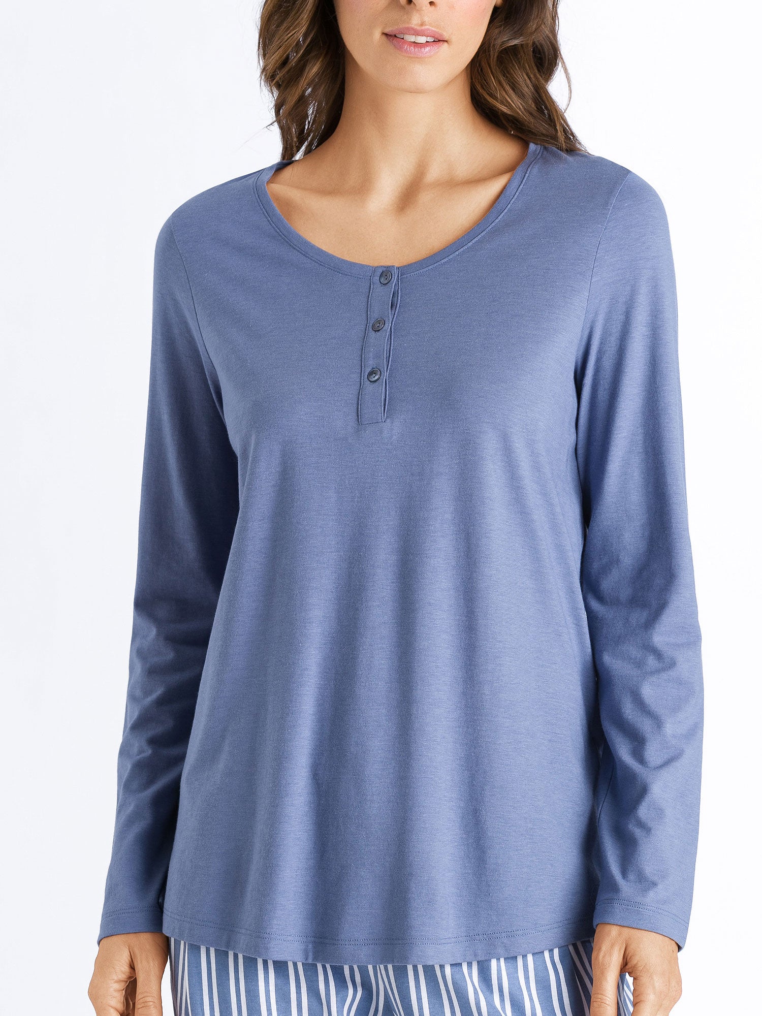 قميص طويل رياضي ومريح باللون الأزرق الناعم مع ياقة خط رقبة مستدير مريحة وصف أزرار رياضي بثلاثة أزرار. قماش جيرسي مفرد ومثالي كـ ملابس النوم أو كـ ملابس منزلية.