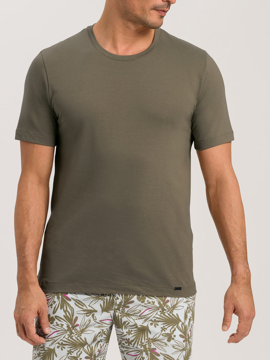 تي شيرت مريح باللون الزيتوني الأخضر خط رقبة مستدير. غير شفاف ومثالي للاسترخاء والسفر. يمكن تنسيقه بشكل ممتاز مع جميع قطع هذه السلسلة.