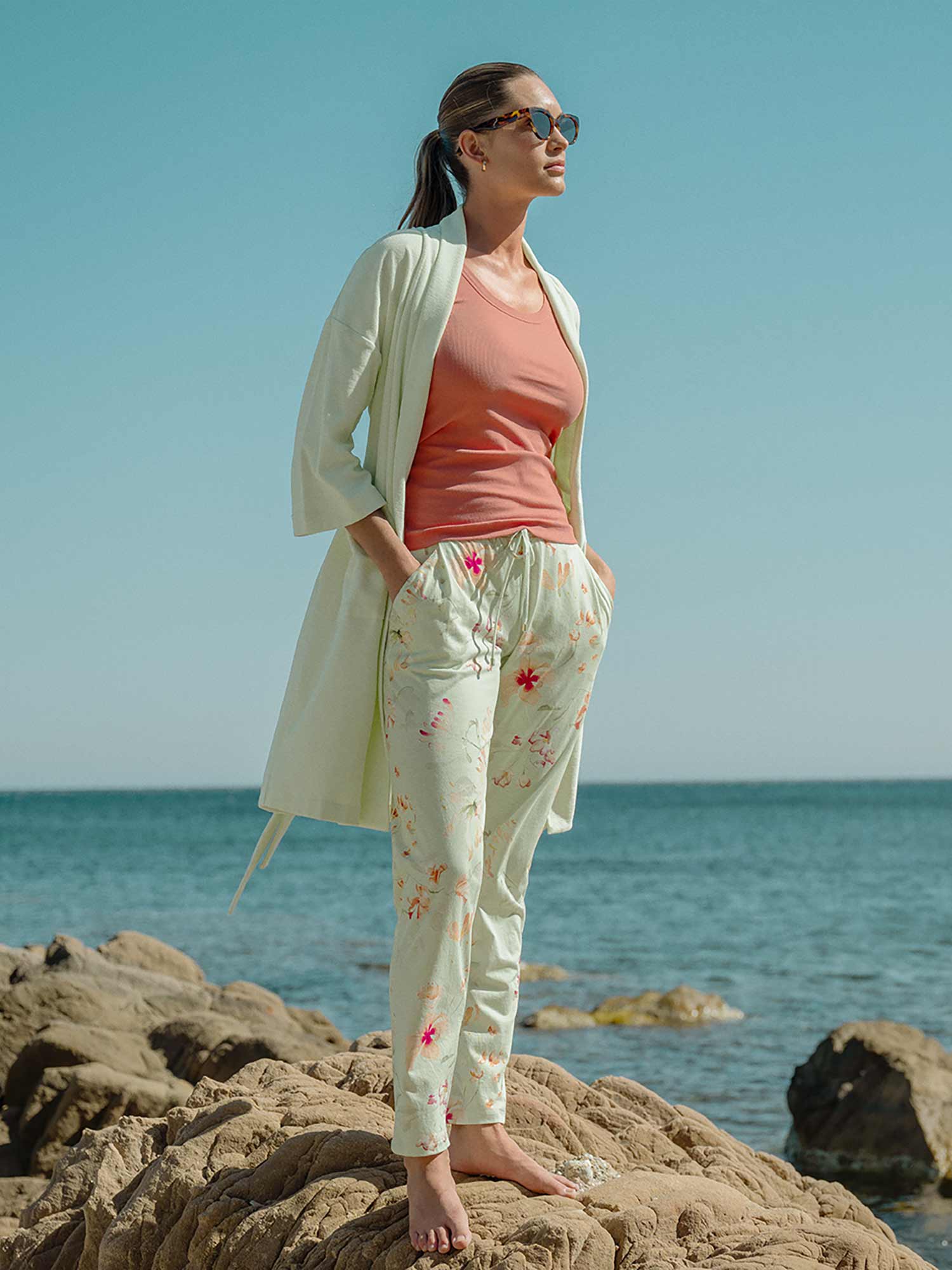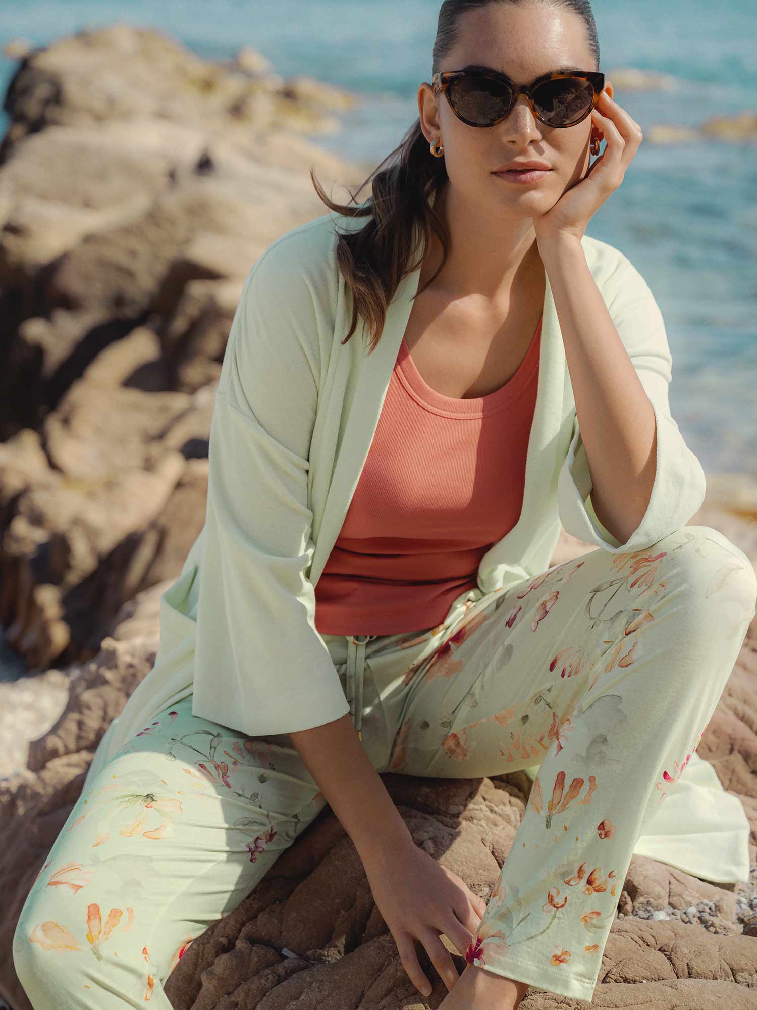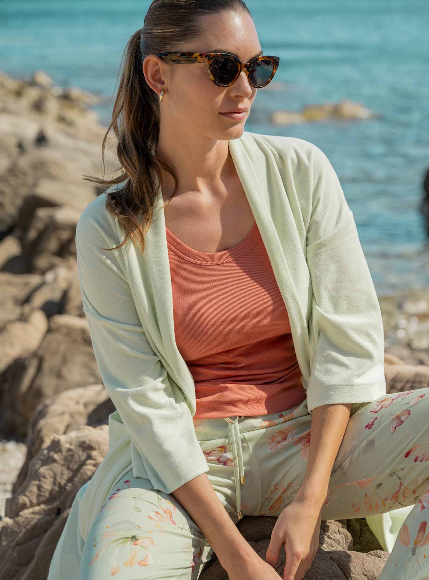 استمتع بيومك الصيفي القادم على الشاطئ أو بزيارة سبا مريحة! مع هذا الرفيق الجديد المفضل، سيصبح كل وقت مستقطع من الحياة اليومية متعة رائعة. بالطبع، يمكنك ارتداء هذا المعطف الناعم والمريح من الفروت في المنزل أيضًا للاسترخاء. لونه المنعش "الشاي الأخضر" يجلب الخفة والفرح في كل لحظة. مع جيوب جانبية عملية وحزام ربط متناسب.