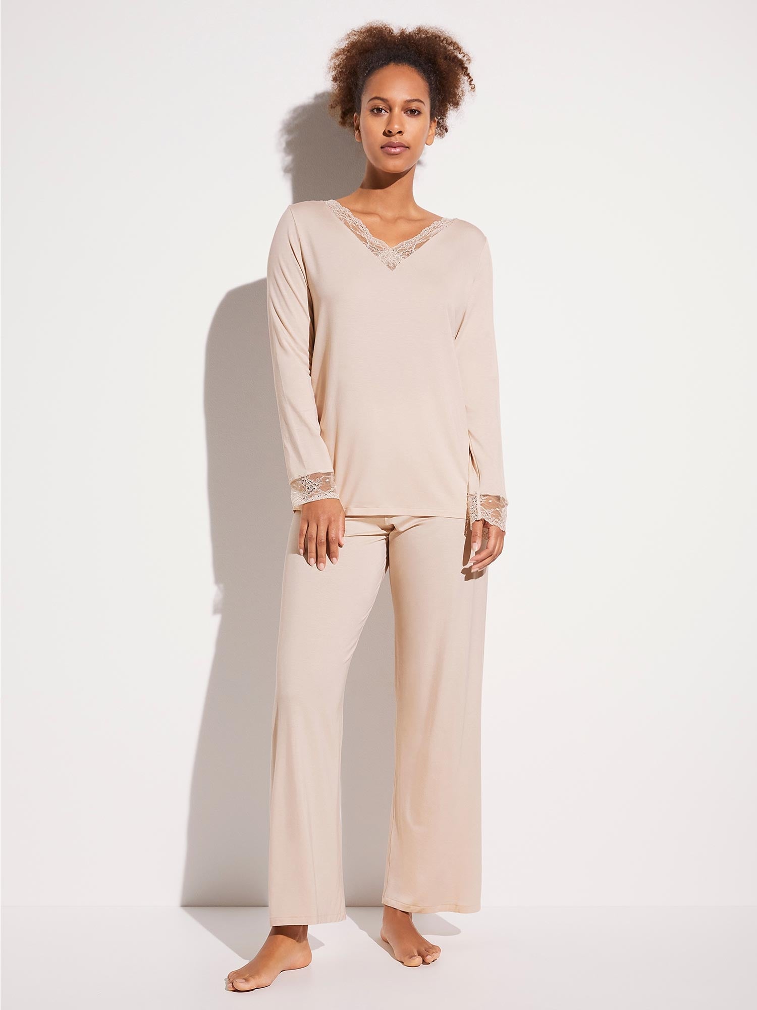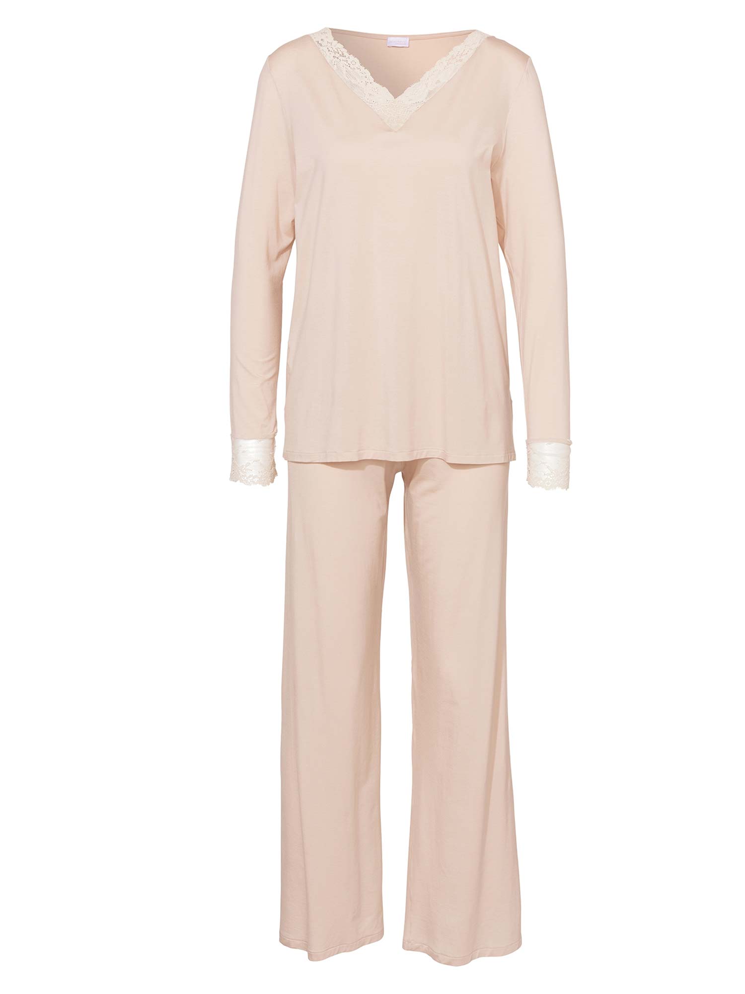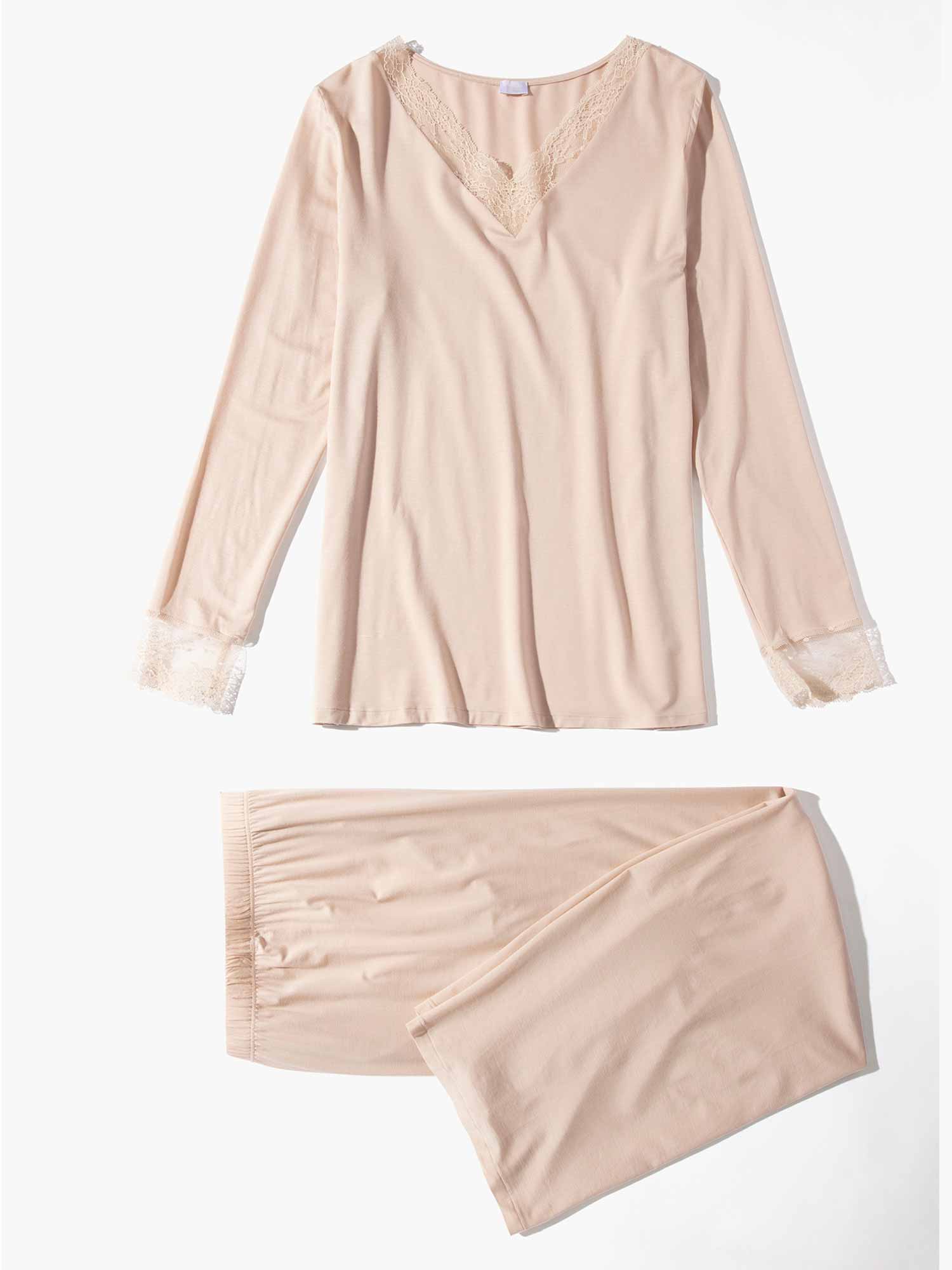 بيجامة بلون الخوخ مع إدخالات من الدانتيل المرن الفاخر عند فتحة العنق V والأكمام. قطعة مريحة وخفيفة لليالي مريحة وباردة! السروال يجلس بشكل مريح بفضل حزام مطاطي مع رباط.