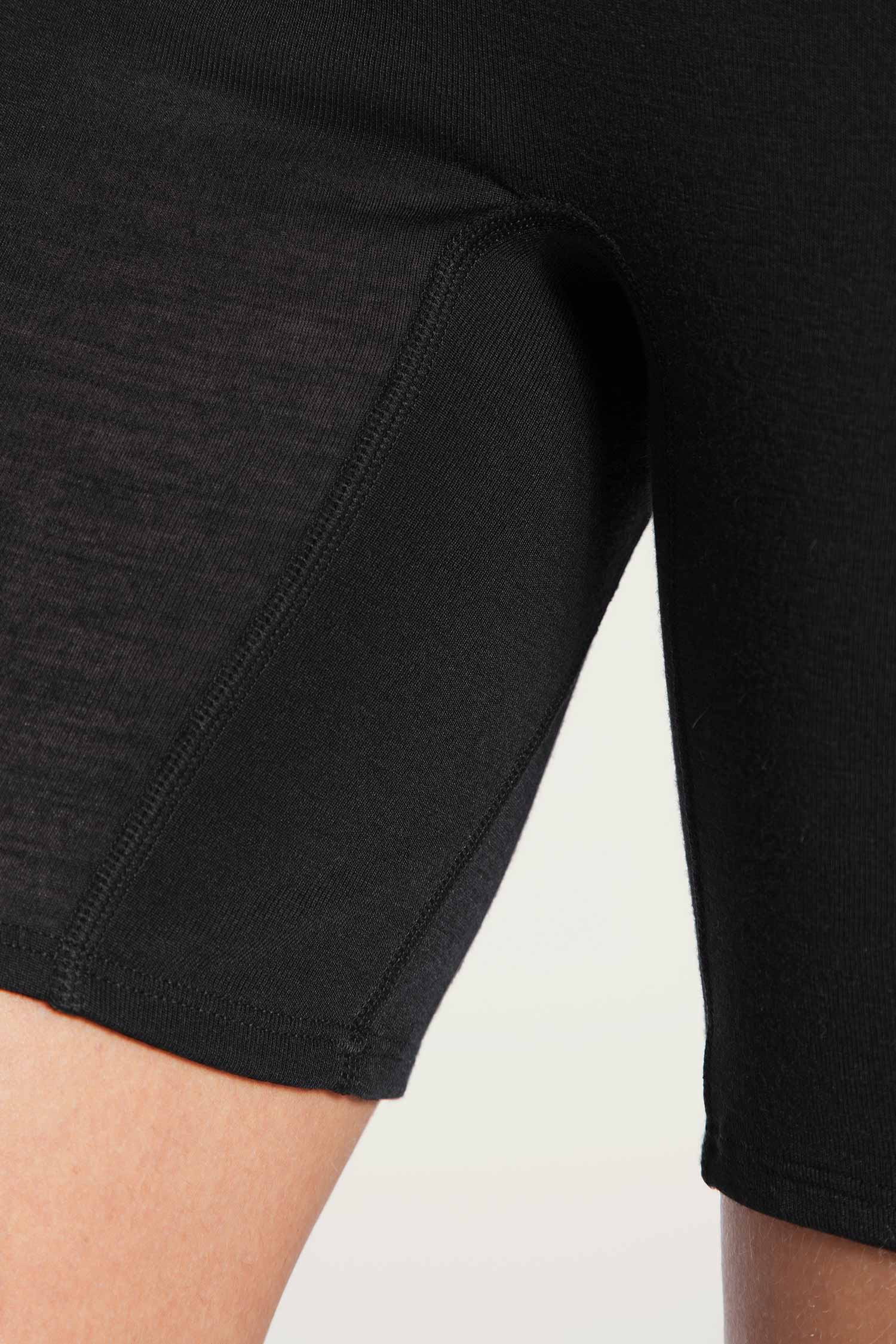 يناسب النسيج المضلّع الناعم جسمك بشكل رائع، بينما يضمن حزام خصر مطاطي المسطح والمريح ملاءمة مثالية دون تضييق. بفضل تهويته وتوازن درجة حرارته، يعد هذا الشورت مثاليًا للأيام الباردة، سواء تحت السراويل أو الفستان.