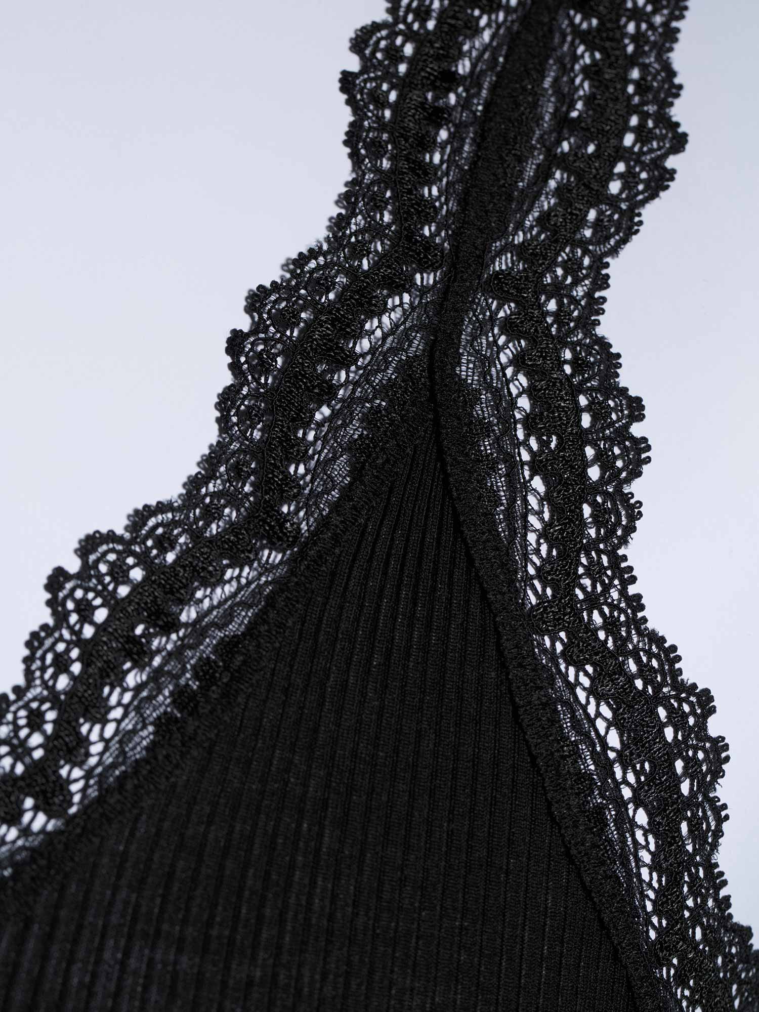Die elegante, tief gerundete Ausschnittform wird kunstvoll veredelt mit zarter französischer Leavers-Spitze, zertifiziert und nummeriert als echte „Dentelle de Calais®“ – ein Statement für Stilbewusstsein und exquisite Details. Die Verarbeitung ohne Seitennähte macht das Top unglaublich komfortabel. Perfekt solo getragen oder als edles Layering-Piece unter Bluse, Strick oder Blazer.