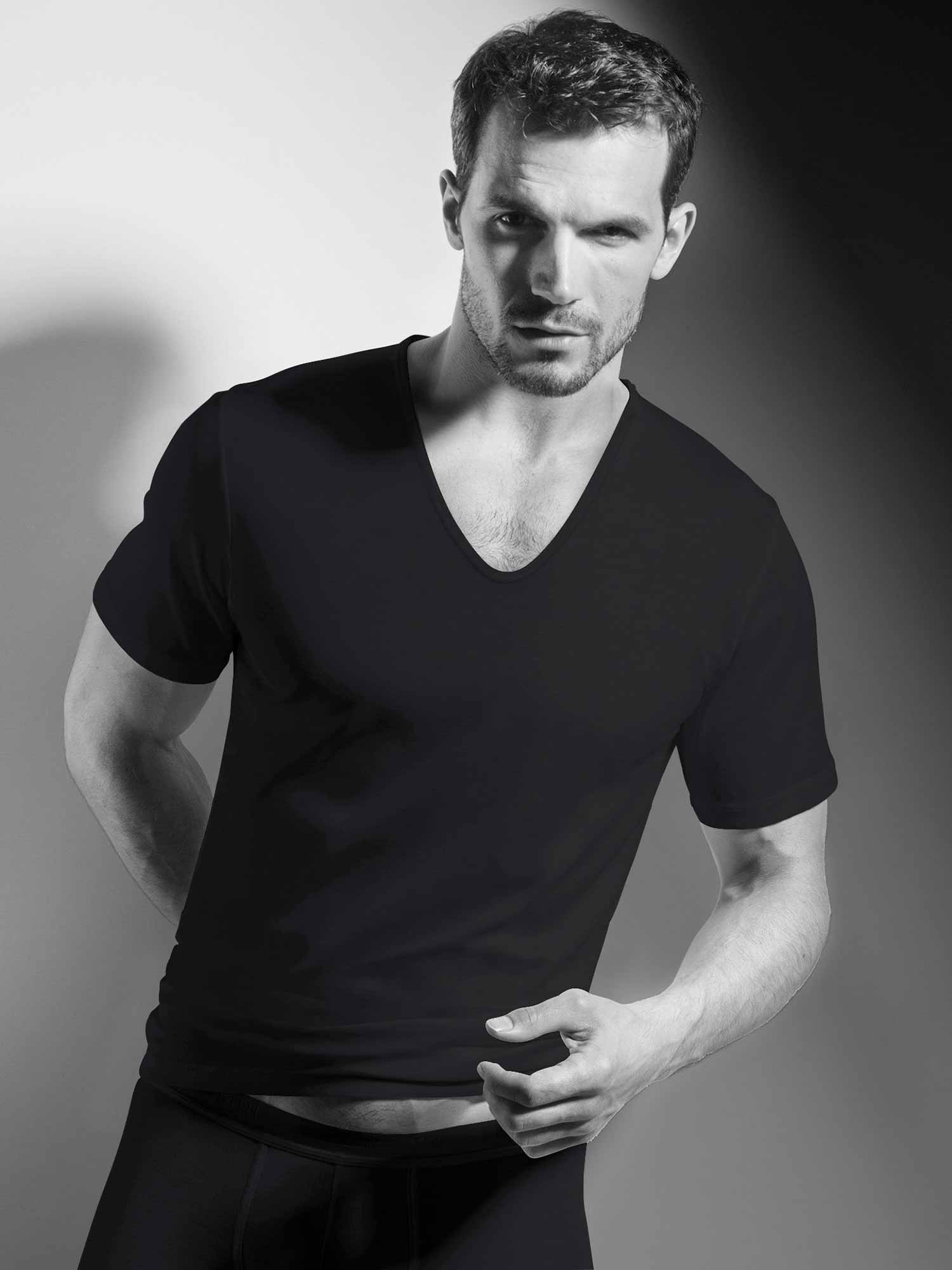 Casually cut V-neck T-shirt with short sleeves from the exclusive SWISSLINE collection. This is knitted from high-quality cotton yarn and is almost exclusively manufactured in Switzerland. The shirt impresses with its fine-rib quality, deep V-neckline, and super comfortable wearing comfort.