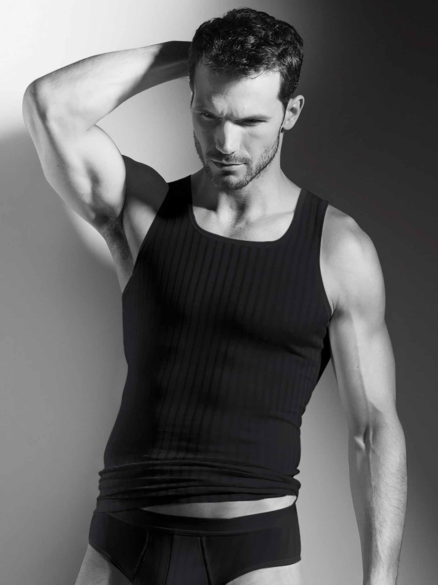 Body-hugging tank-Top from the exclusive SWISSLINE collection. This is knitted from high-quality cotton yarn and produced almost exclusively in Switzerland – a commitment to the Swiss workplace. The shirt impresses with its special fine stripe structure, wide straps, and slightly square neckline.
