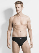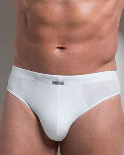 Slip made of breathable, climate-regulating, and odor-inhibiting material. With fabric-covered waistband. The Lyocell or Tencel fiber is produced in an environmentally friendly manner from sustainably grown wood (cellulose). Fine rib quality. Front area (suspensorium) double-layered.