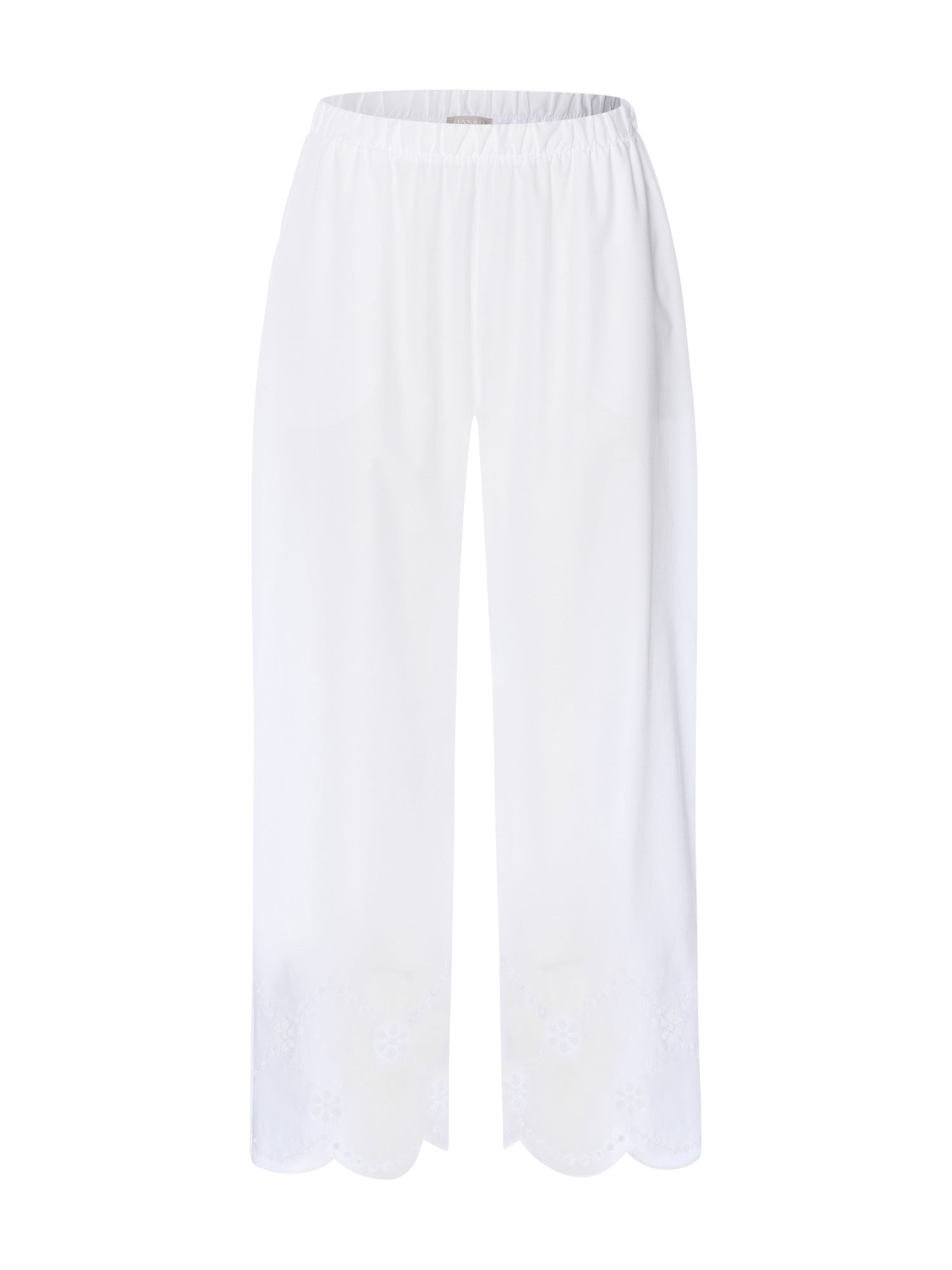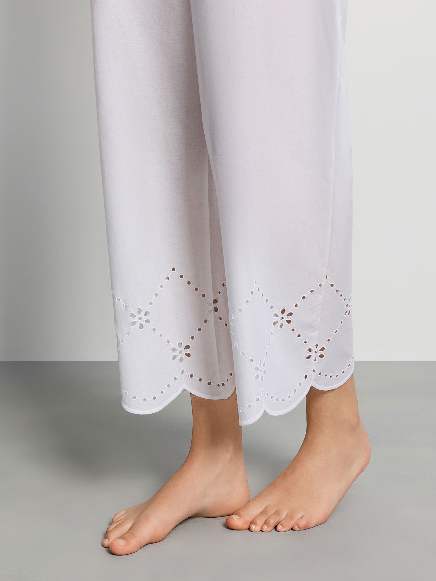 Finely placed eyelet embroidery sets charming accents and gives the look a feminine, artisanal touch. Whether barefoot on the beach, relaxed while strolling through the city, or elegantly combined for mild nights at the bar – these crop pants combine comfort, style, and summer elegance in a particularly effortless way.