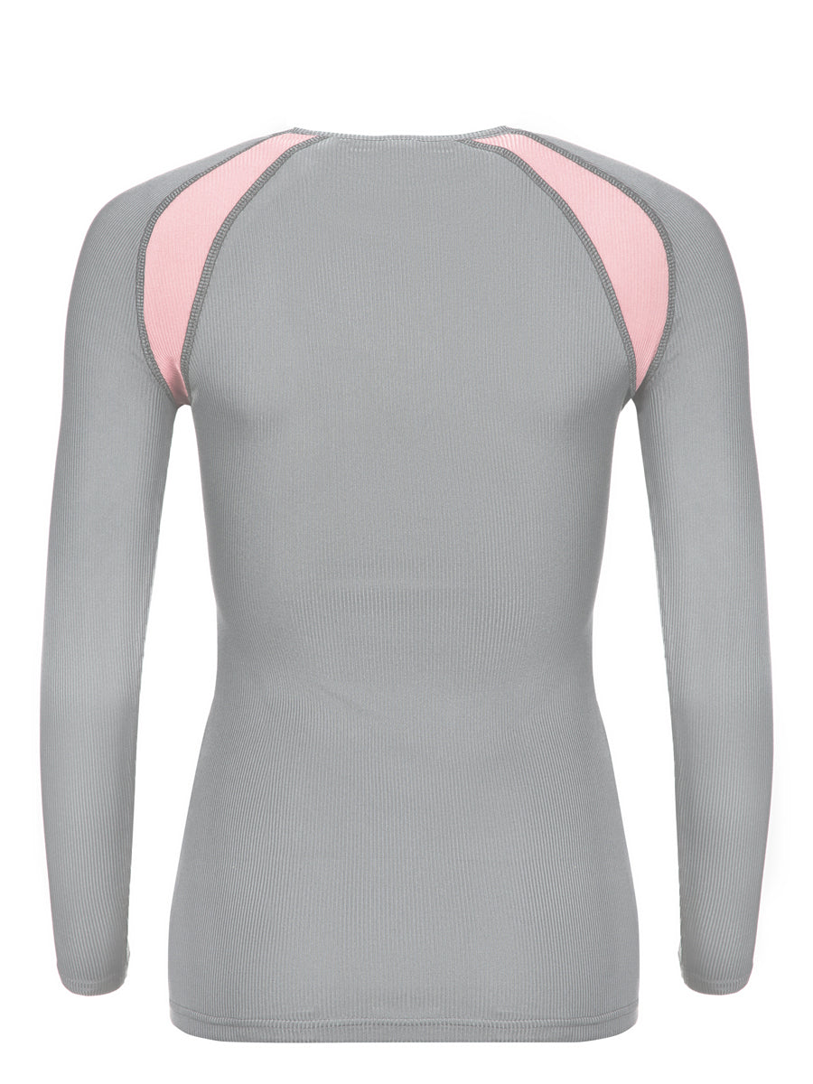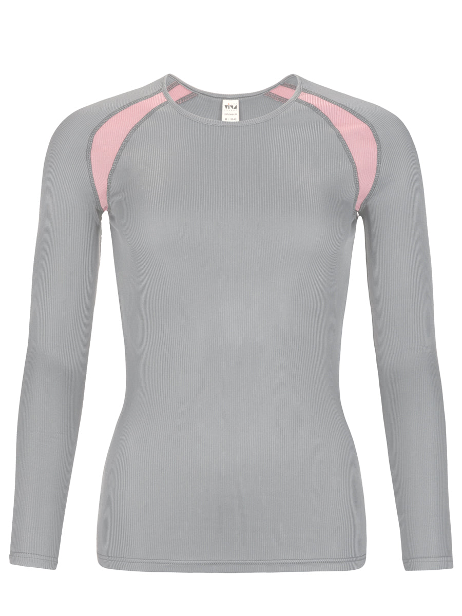 Beautifully crafted longshirt made of noble, fine-mesh, and stretchy organic silk in a sporty ribbed look. Visually sophisticated pink inserts on the front and back. round neck, raglan sleeves with beautiful seam appearance. High moisture transport, ideal as the first layer for sports and leisure.