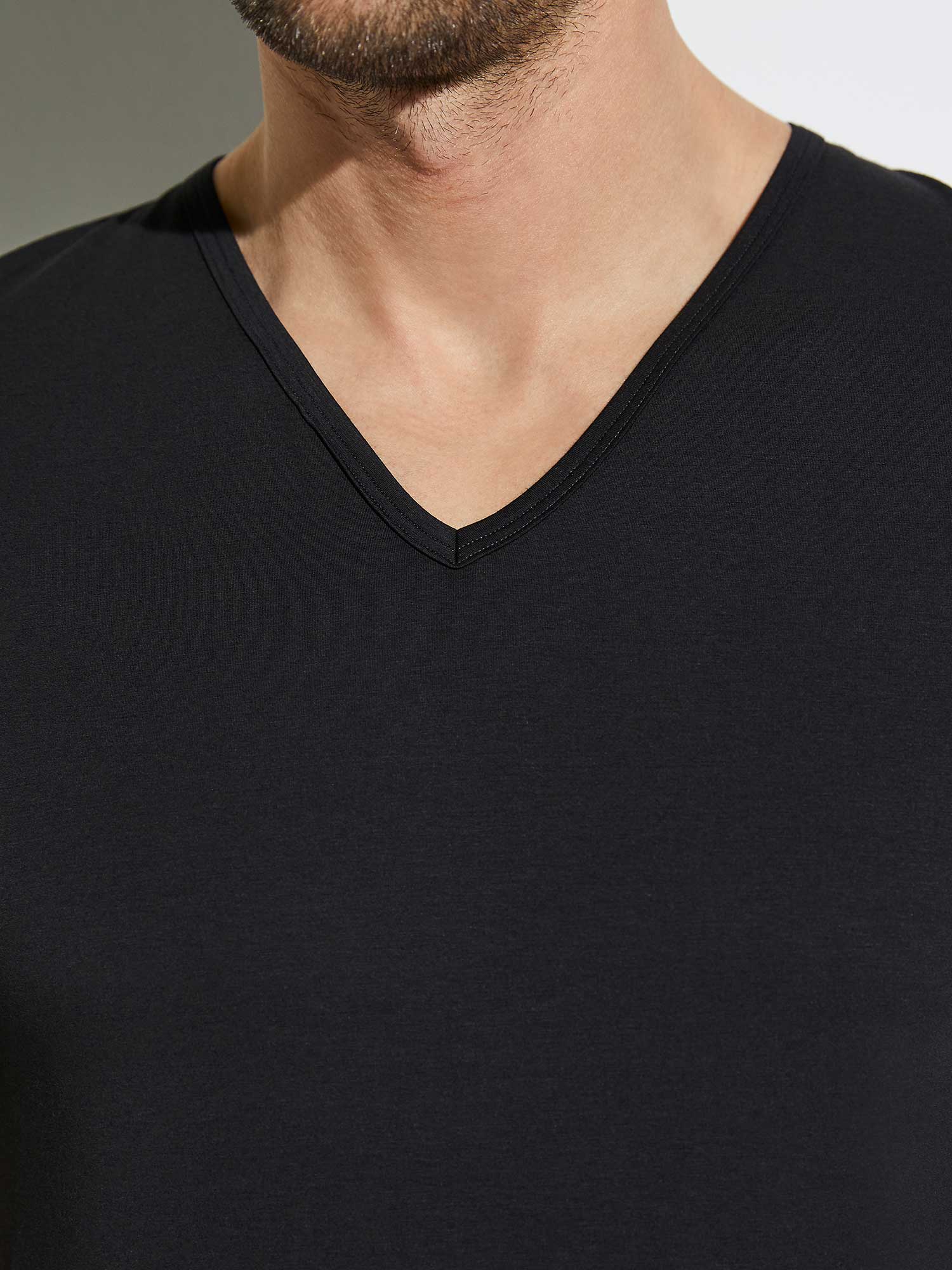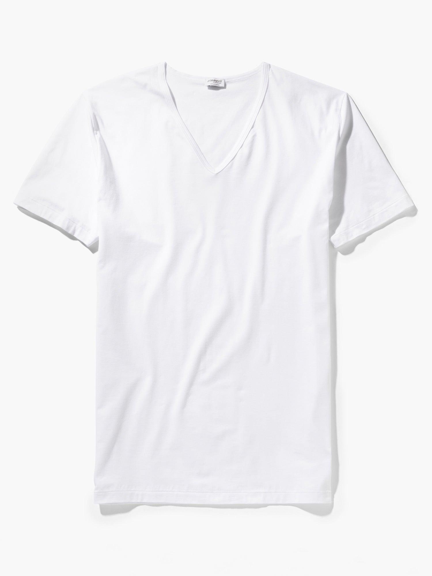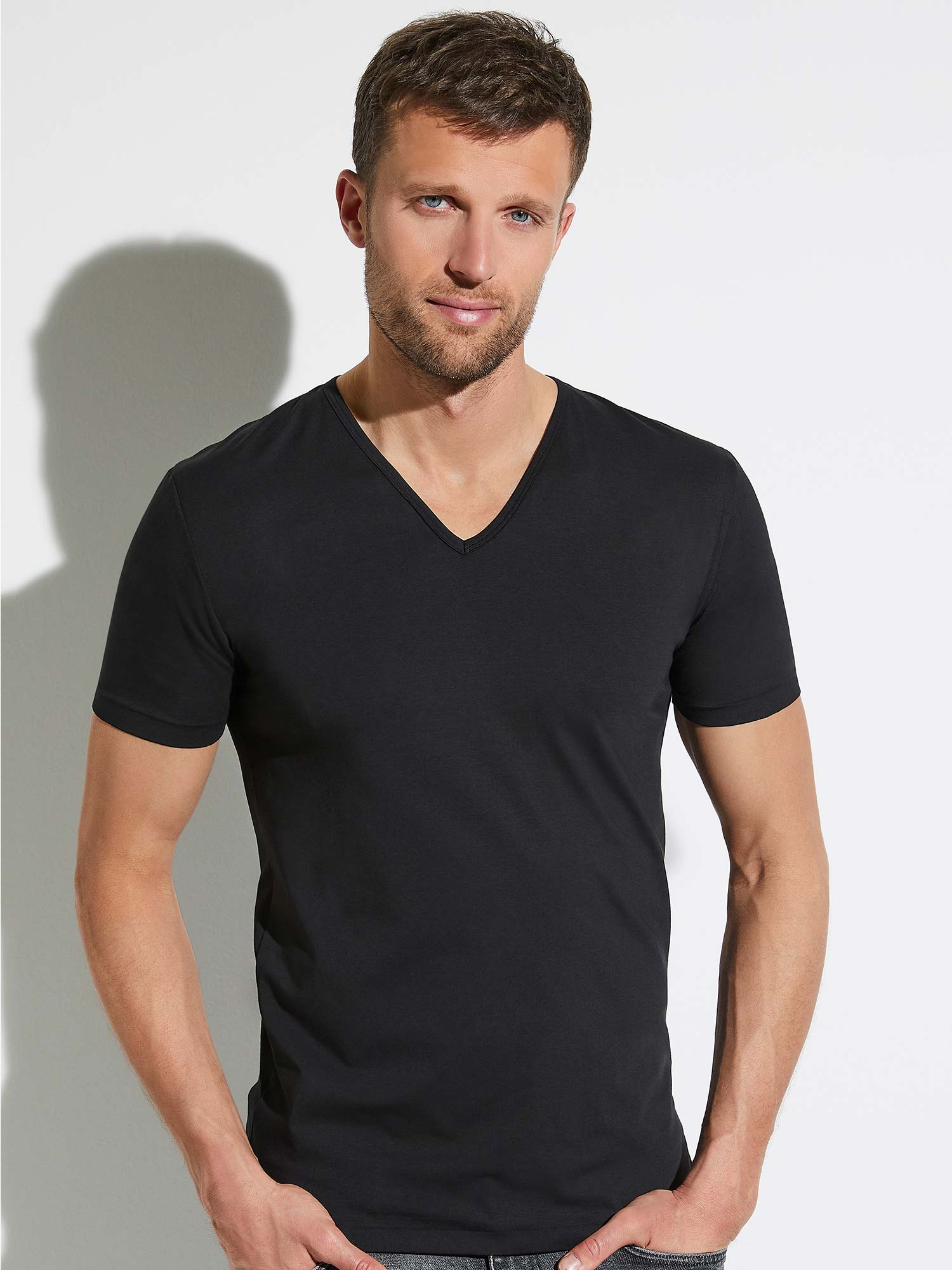 Nicely fitting V-neck T-shirt; ideal for wearing under a shirt or on its own. Made from ultra-fine jersey of exquisite Pima cotton yarn – with elastane for the perfect fit. Shape-retaining and easy to care for. This finest knitting technique in the world results in an elegant, matte sheen.