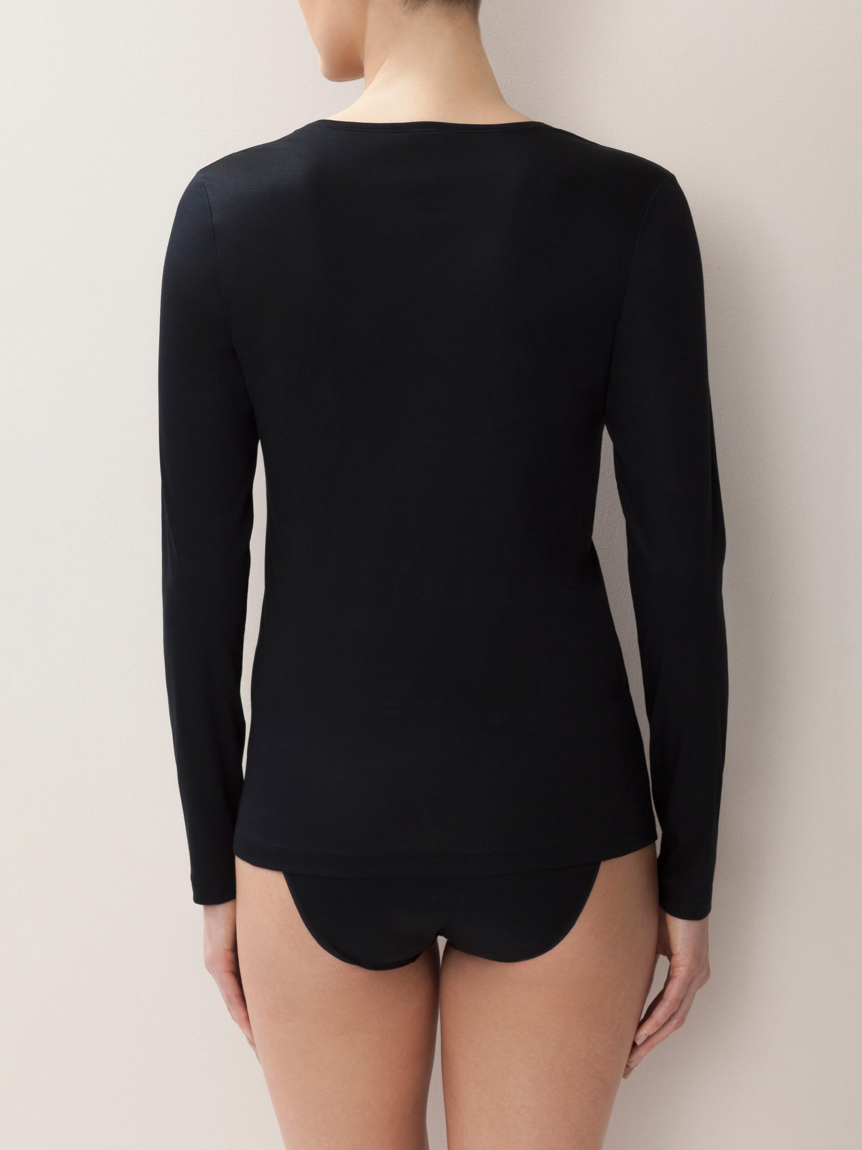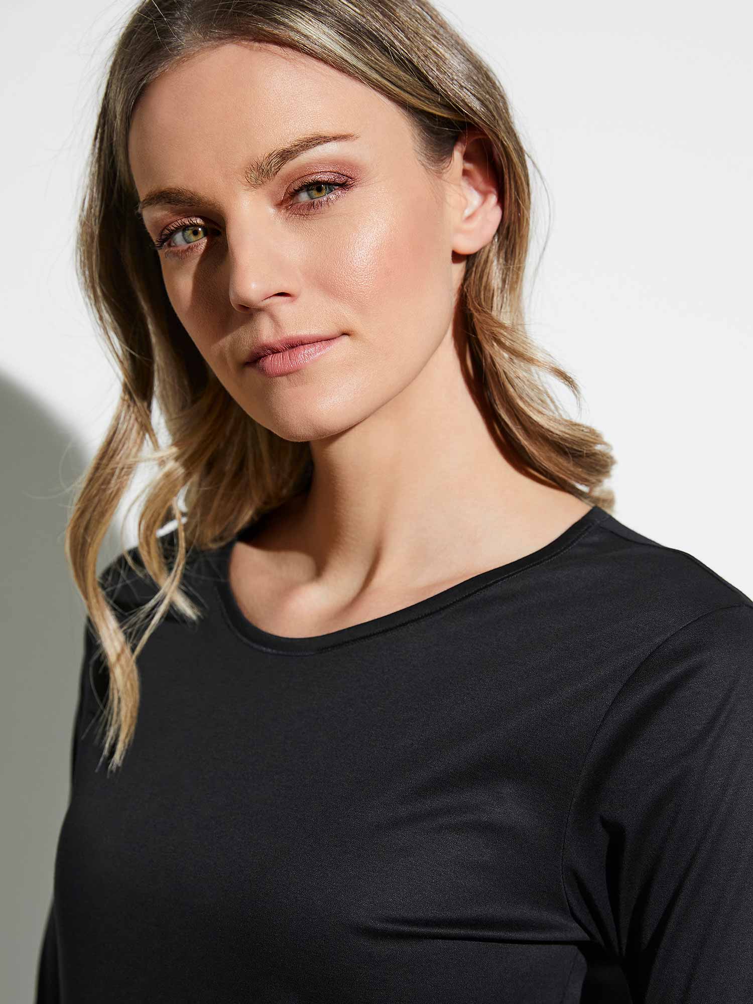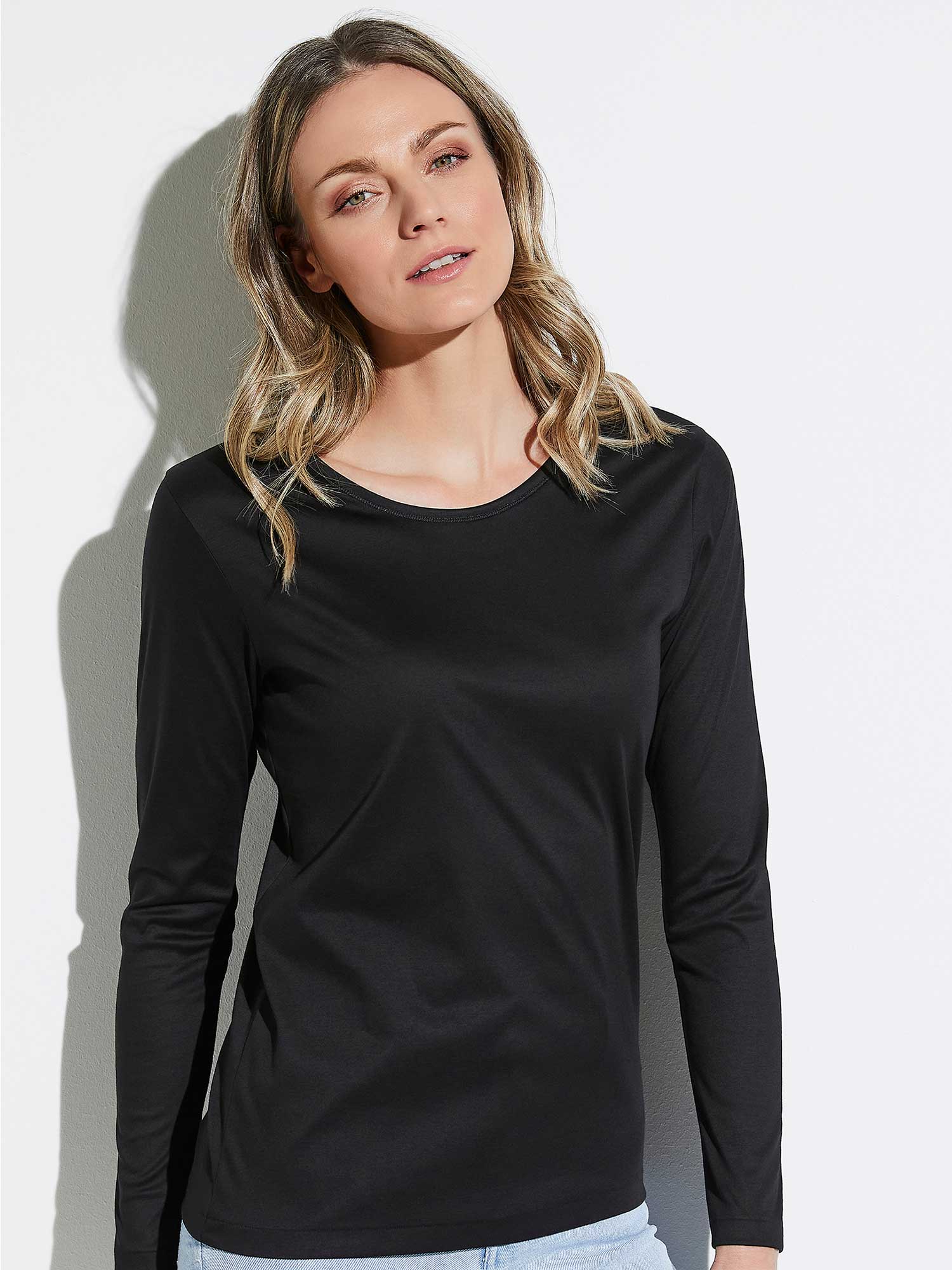 Minimalist, elegant longshirt made from Sea Island Cotton with a slightly shiny satin finish at the neckline. The Sea Island cotton can be compared in its softness to cashmere or silk. This shirt thus becomes an incomparably luxurious piece of perfection and can also be worn outside.