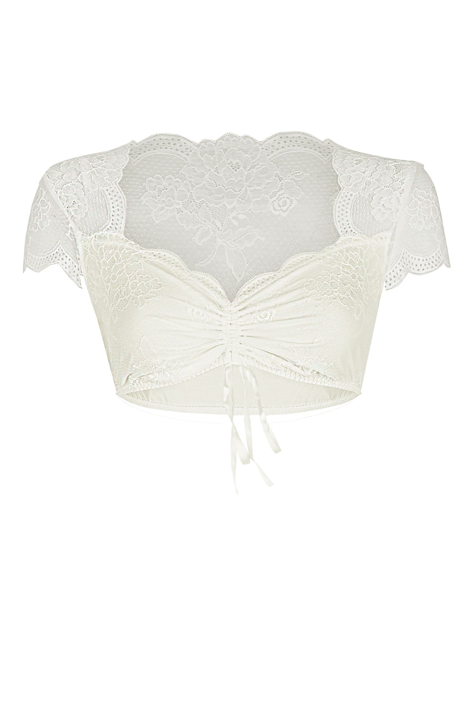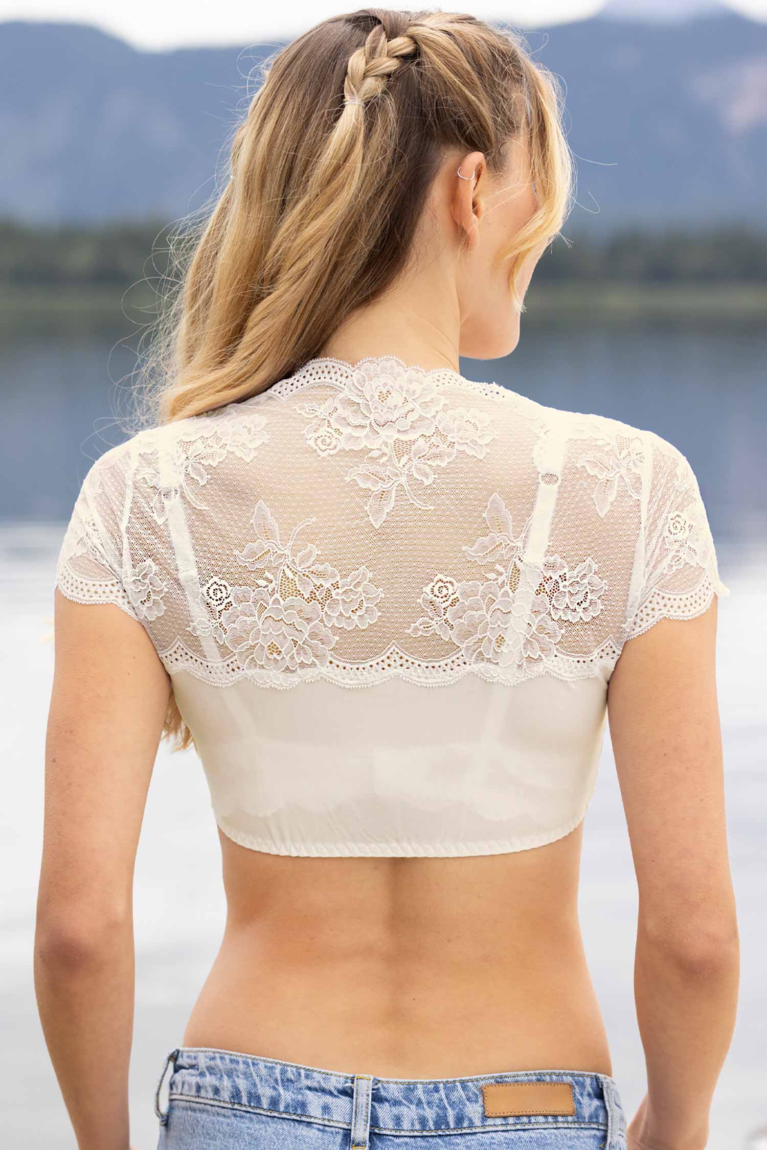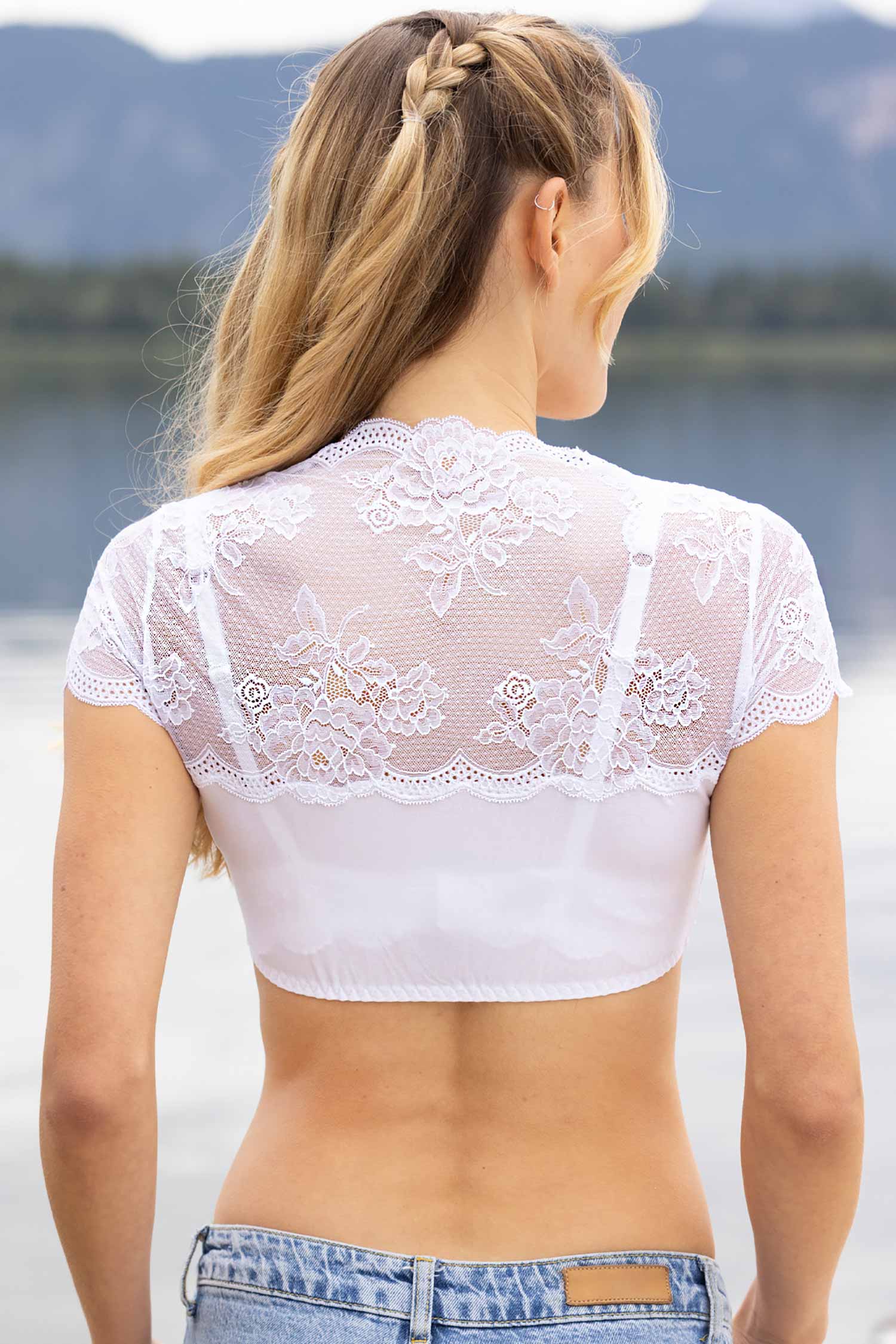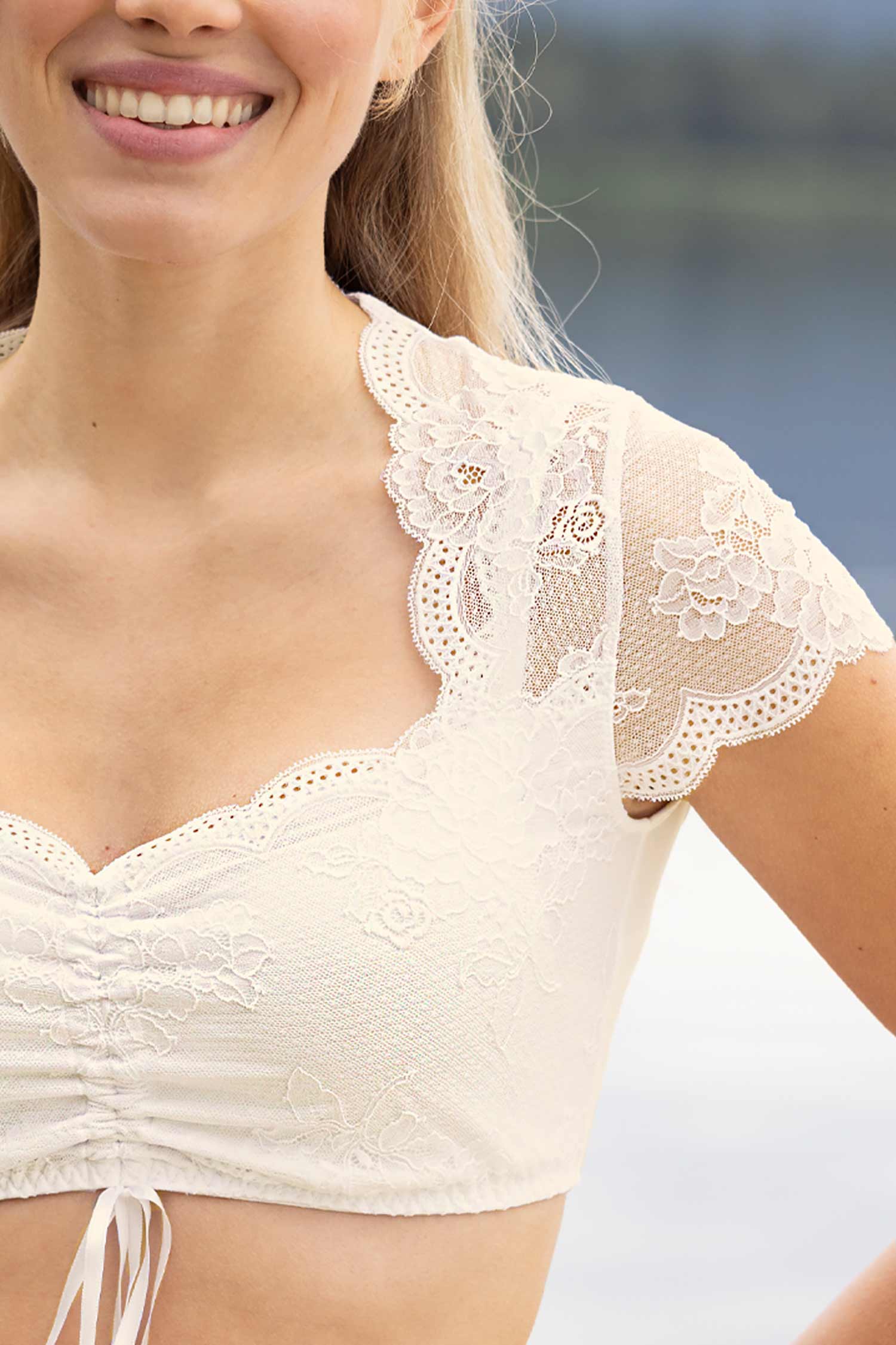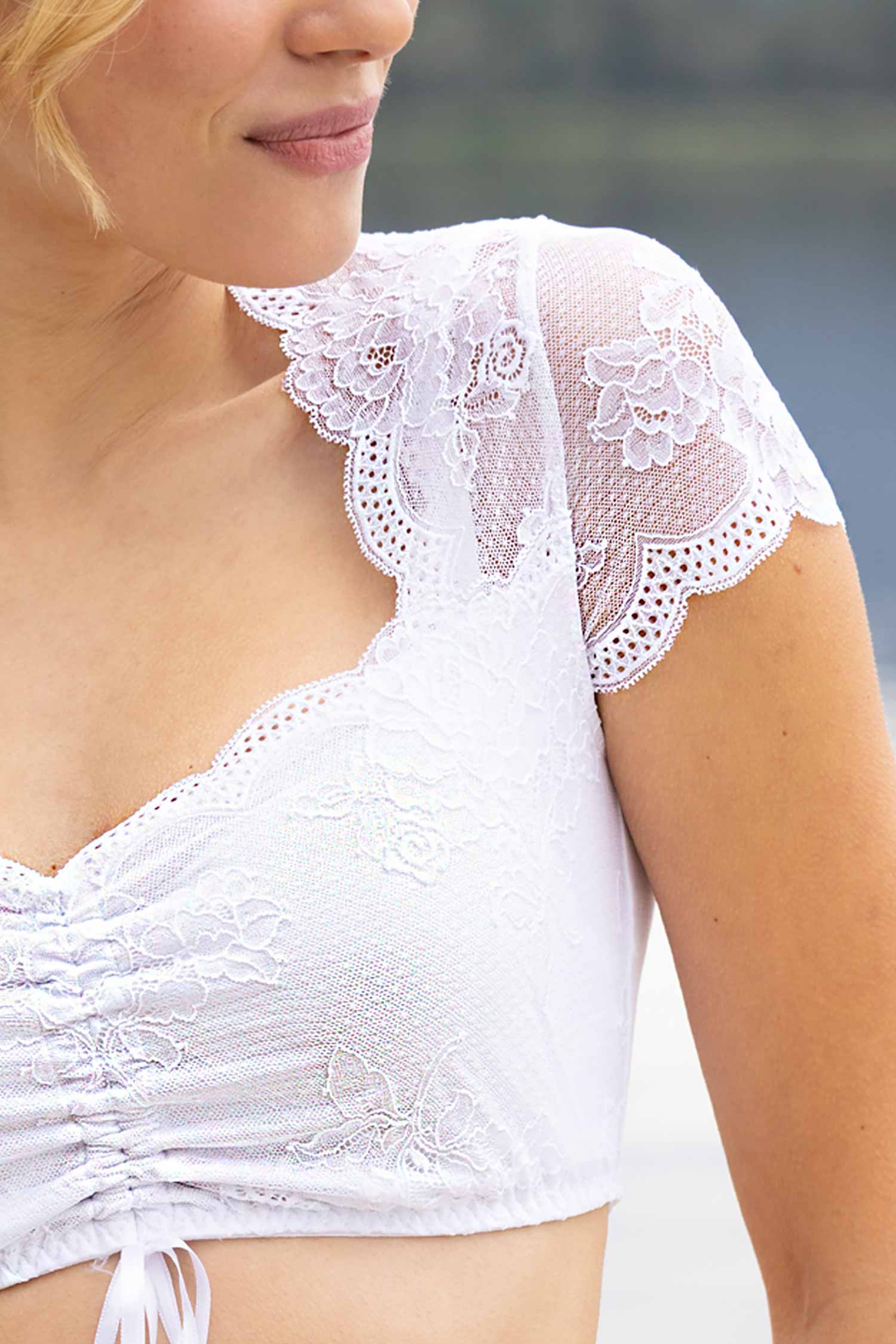 The Dirndl-Blouse Sybille is a dream of flowers come true. Delicate lace in a romantic floral design gives it a playful, feminine character, while the generous, heart-shaped neckline with filigree lace detail accentuates the décolleté seductively yet stylishly.