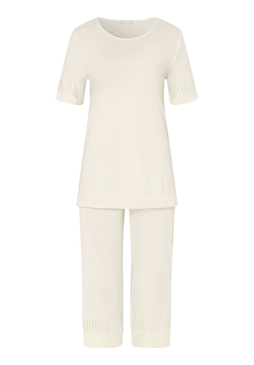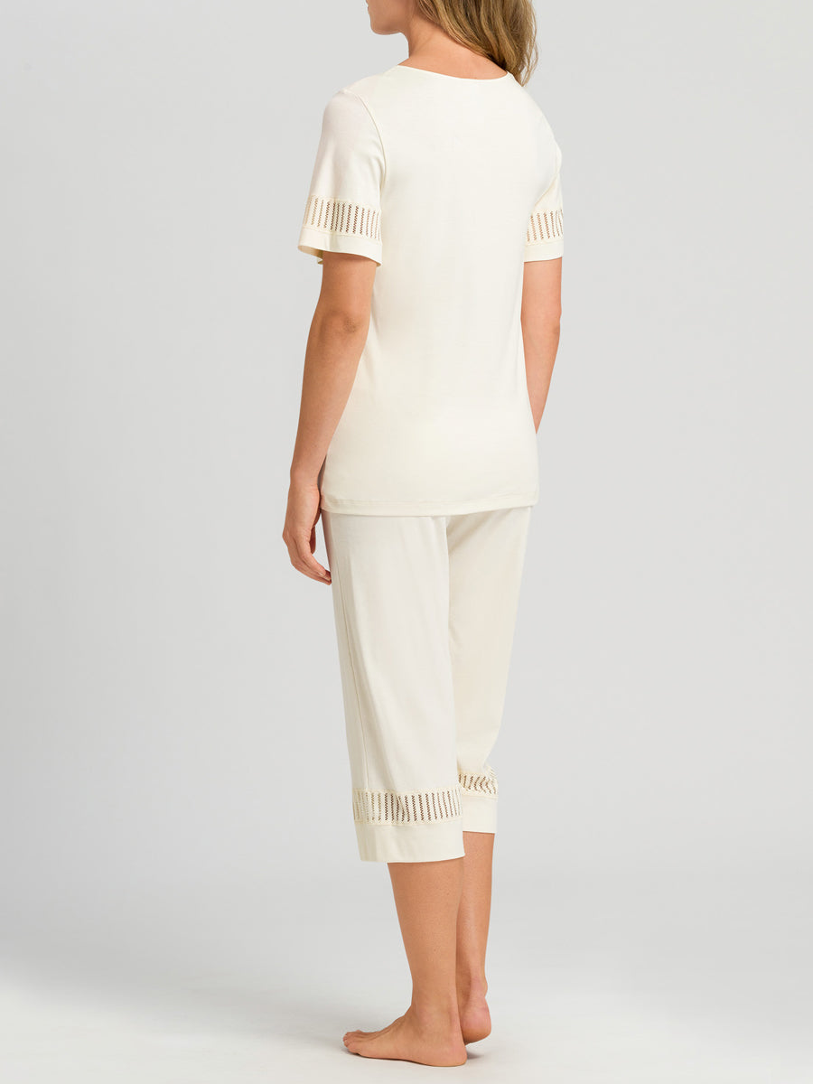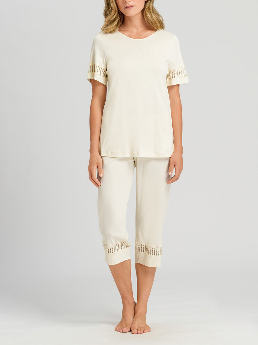 Pyjama jaune citron, confortable, en coton mercerisé avec un léger éclat. Inserts en dentelle décoratifs sur les manches et les jambes du pantalon 3/4 – avec bordure ceinture élastique.