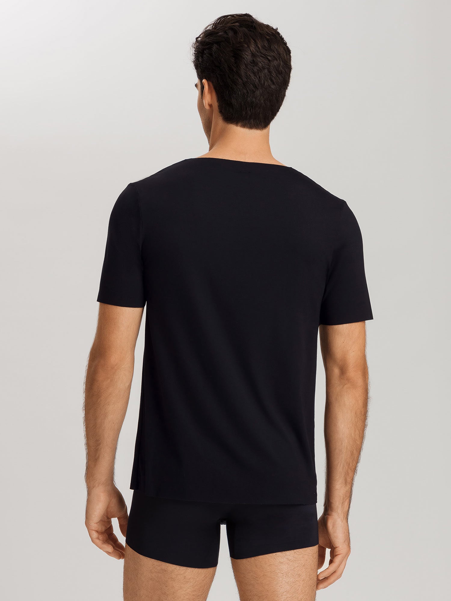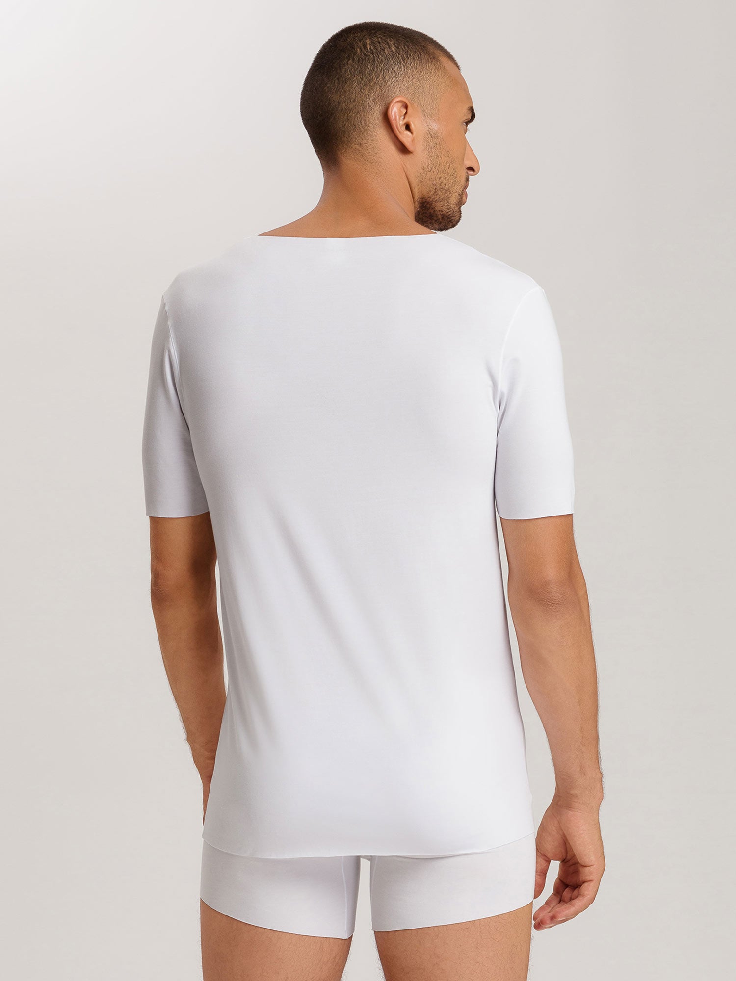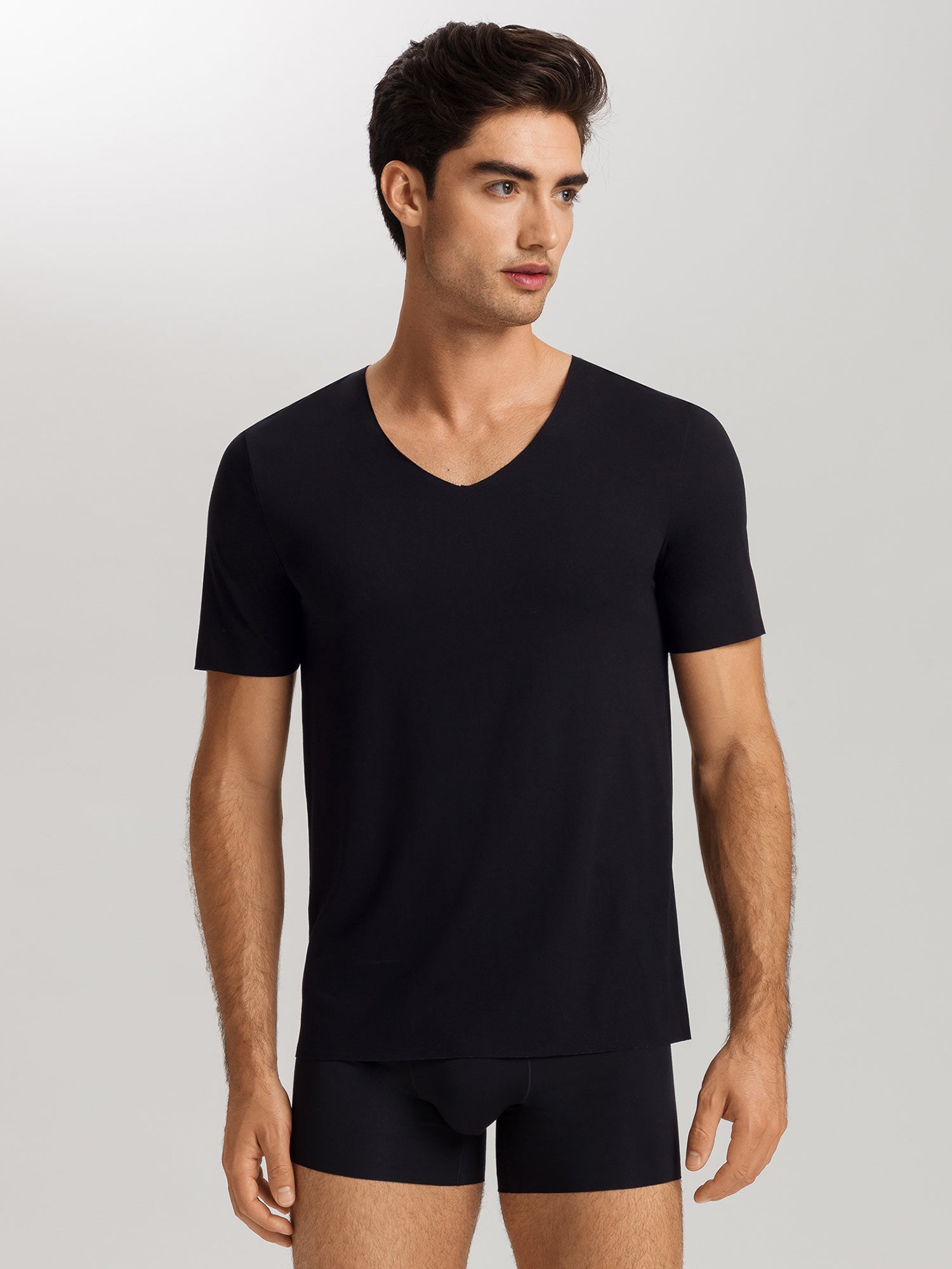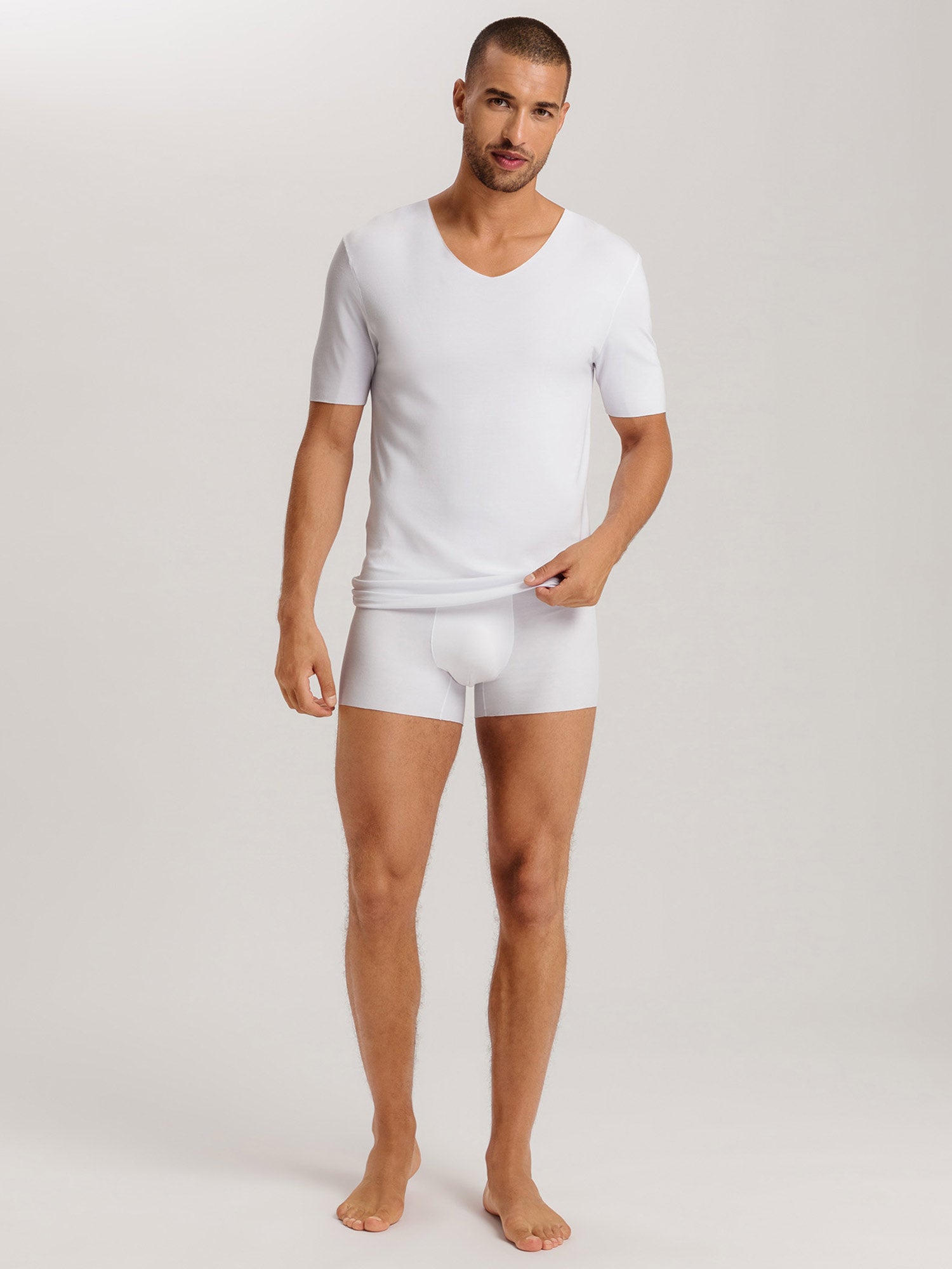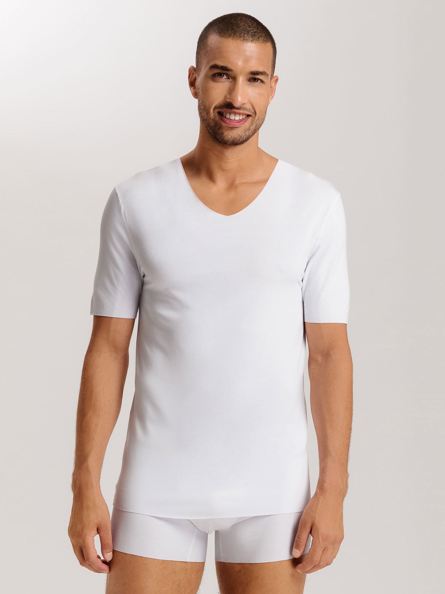 Les pièces de la nouvelle série HANRO CLEAN CUT sont à peine perceptibles et presque invisibles. Cela est assuré par le mélange de micromodal et d'élasthanne ultra-doux et les finitions sans coutures aux manches, ourlets, encolure et jambes grâce à la technologie moderne Free-Cut. Le t-shirt avec le col en V profond est parfait sous les chemises de bureau.