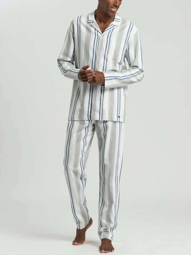 Questo comodo pigiama/leggero Abito da casa in flanella di cotone tessuto è versatile - per dormire, rilassarsi e riposare. Motivo a righe in colori chiari. Parte superiore con bottoni; pantaloni con due tasche laterali e vita elastica con cordoncino.