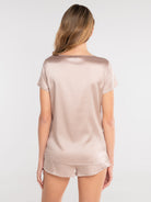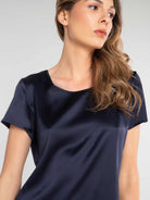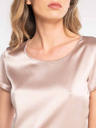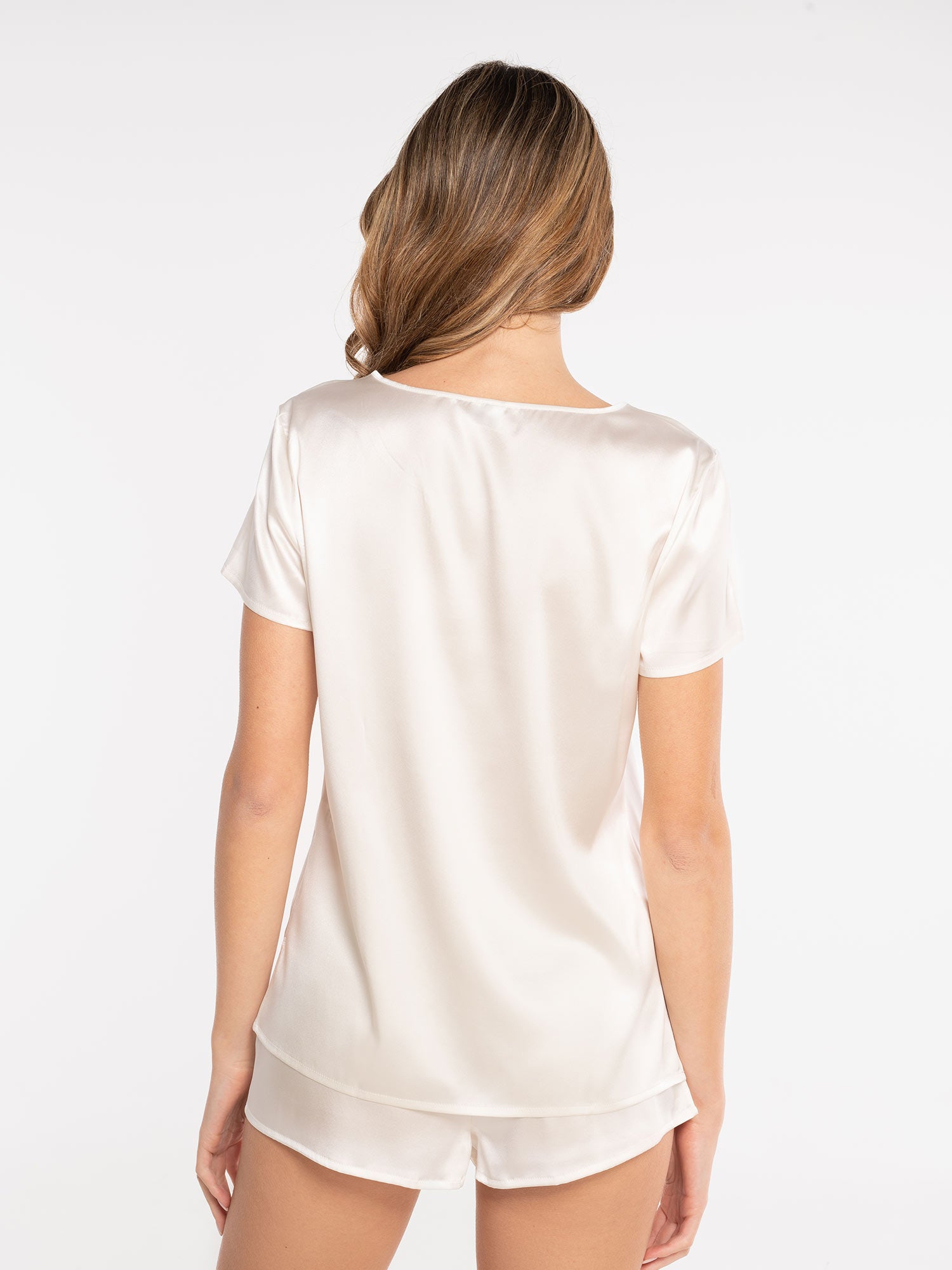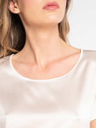 Con il suo taglio rilassato, le maniche corte e lo scollo rotondo, è versatile da abbinare - come affermazione di stile o come elegante capo a strati. L'esclusivo raso di seta elasticizzato nasce dalla tessitura di un filamento di seta finemente ritorto. Questo crea un tessuto che, nonostante la sua delicatezza, è straordinariamente resistente - poiché la seta, a parità di peso, è più forte dell'acciaio.