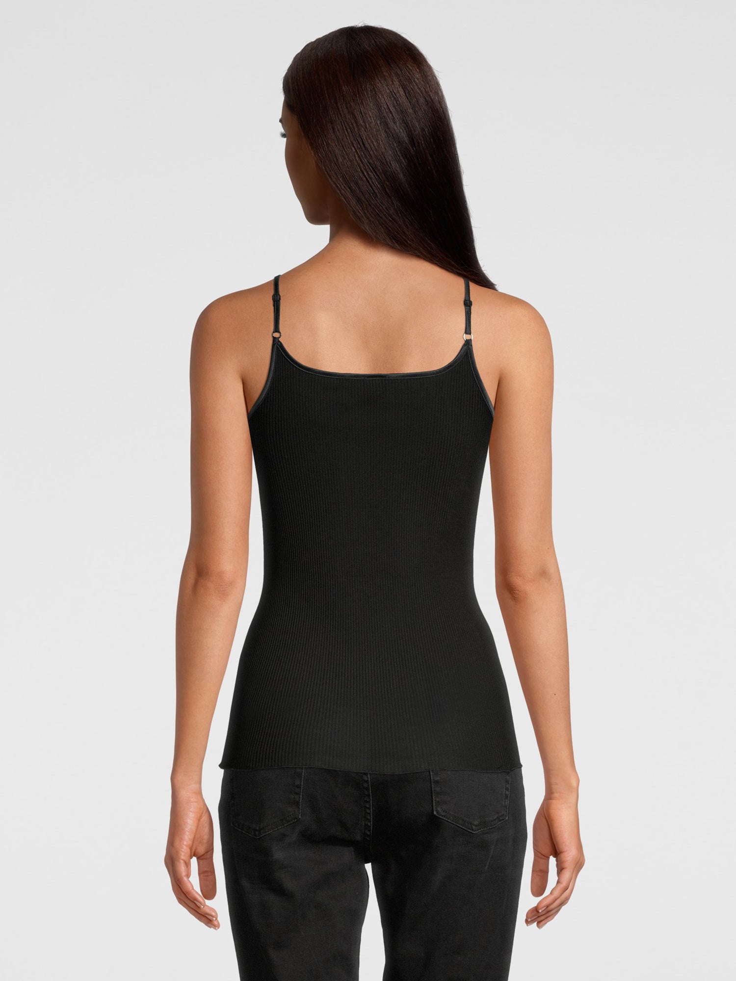 La fine struttura a coste garantisce una vestibilità perfetta e un Comfort d'uso confortevole, mentre la lavorazione senza cuciture assicura il massimo comfort. Lo scollo femminile, profondamente arrotondato, è elegantemente rifinito con un bordo in satin lucido, conferendo al design semplice un tocco particolarmente elegante.