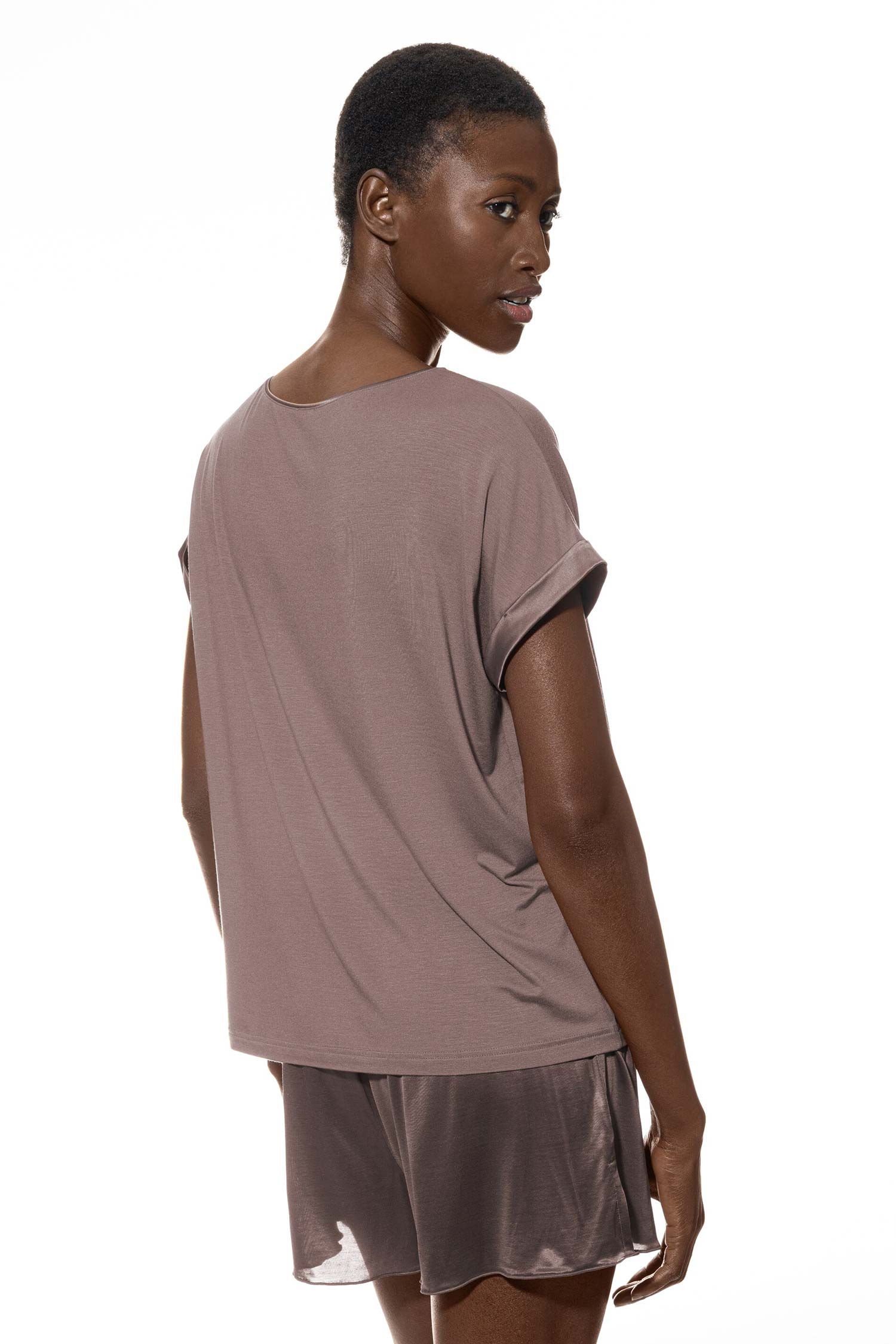 Il tessuto modale fluente accarezza la tua pelle, mentre i delicati dettagli in raso sui bordi delle maniche aggiungono un tocco raffinato ed elegante. Il collo ampio scollo rotondo e le maniche scese conferiscono alla maglietta una silhouette rilassata e moderna – perfetta per ogni occasione. Che sia come base elegante per il tuo look a strati o come artista solista raffinato: questo capo essenziale del guardaroba è un vero must-have per le donne che amano la qualità e il lusso per la vita quotidiana.