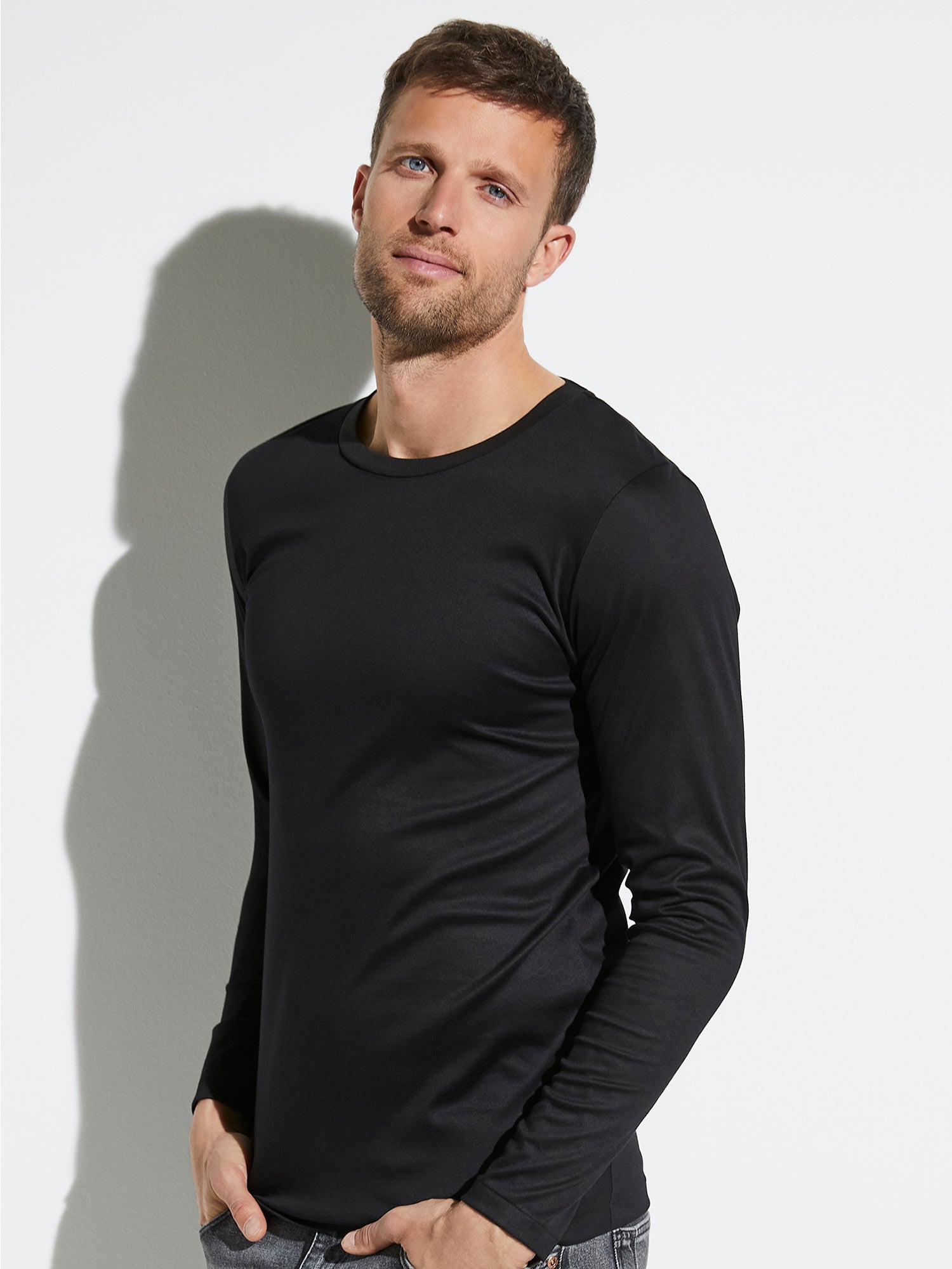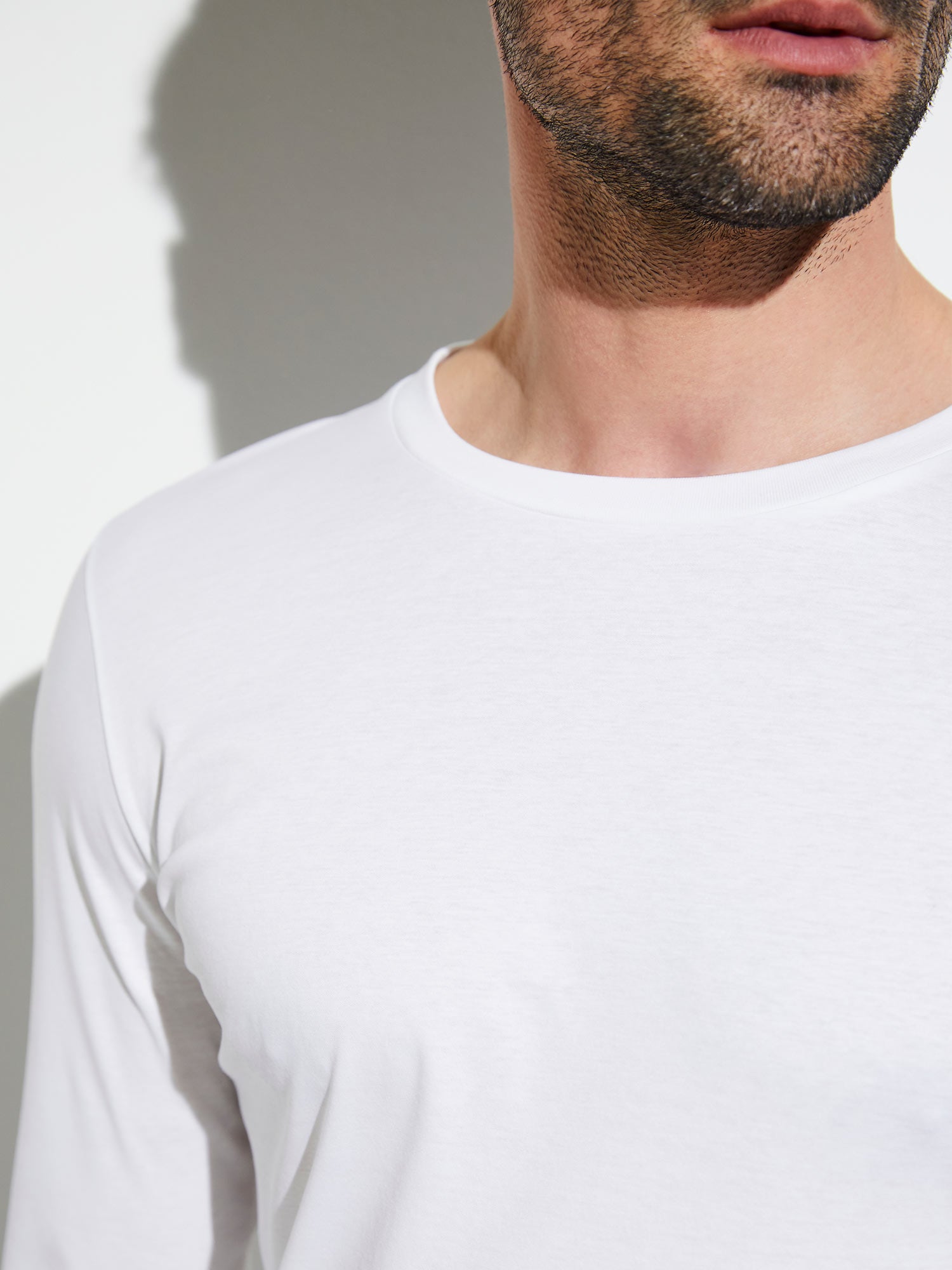 Maglia a maniche lunghe puristica in cotone Sea-Island con bordo leggermente lucido allo scollo.