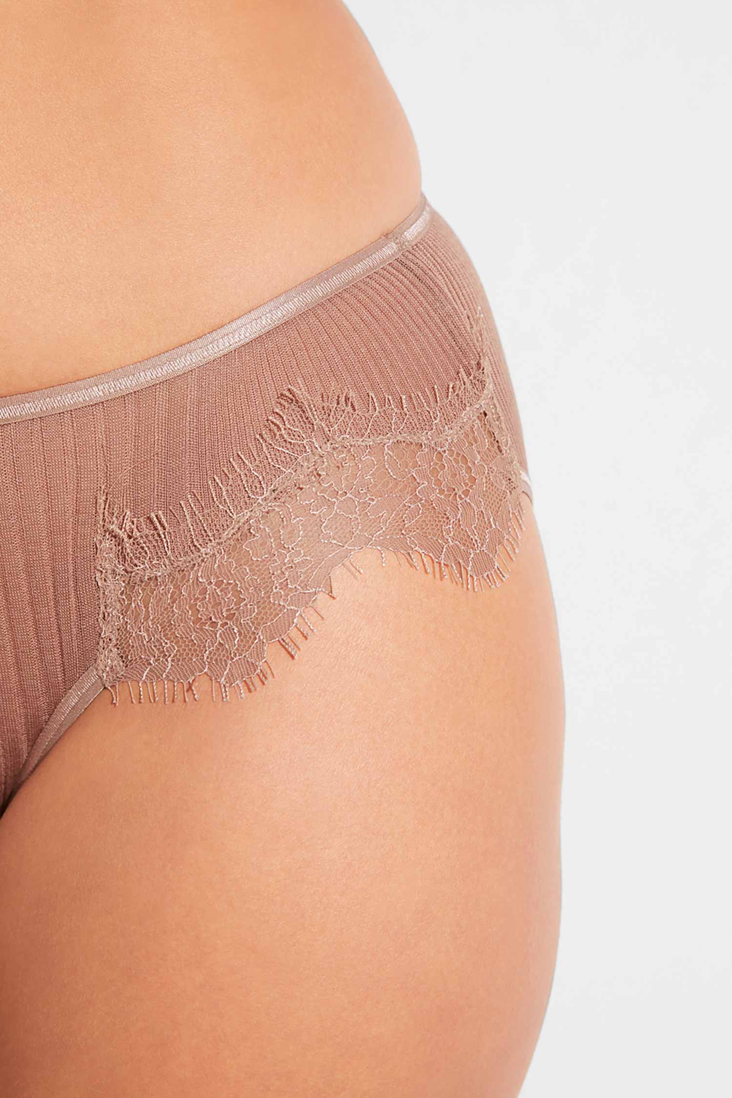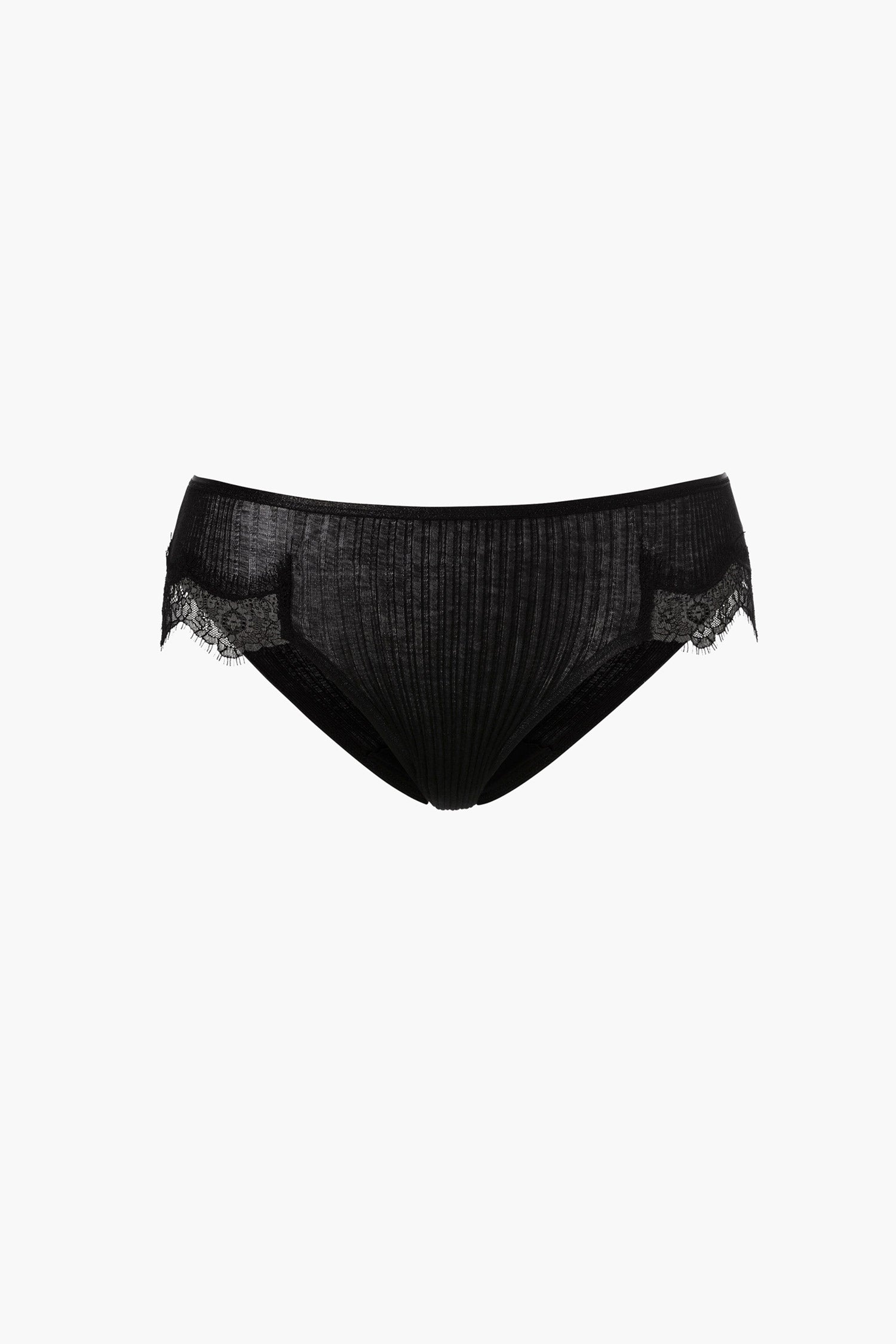 Un elegante e straordinariamente fine Scivolamento con inserto in pizzo a ciglia sugli orli delle gambe nel famoso e iconico Zimmerli-Richelieu-Rib. L'orlo è rifinito con un nastro lucido.