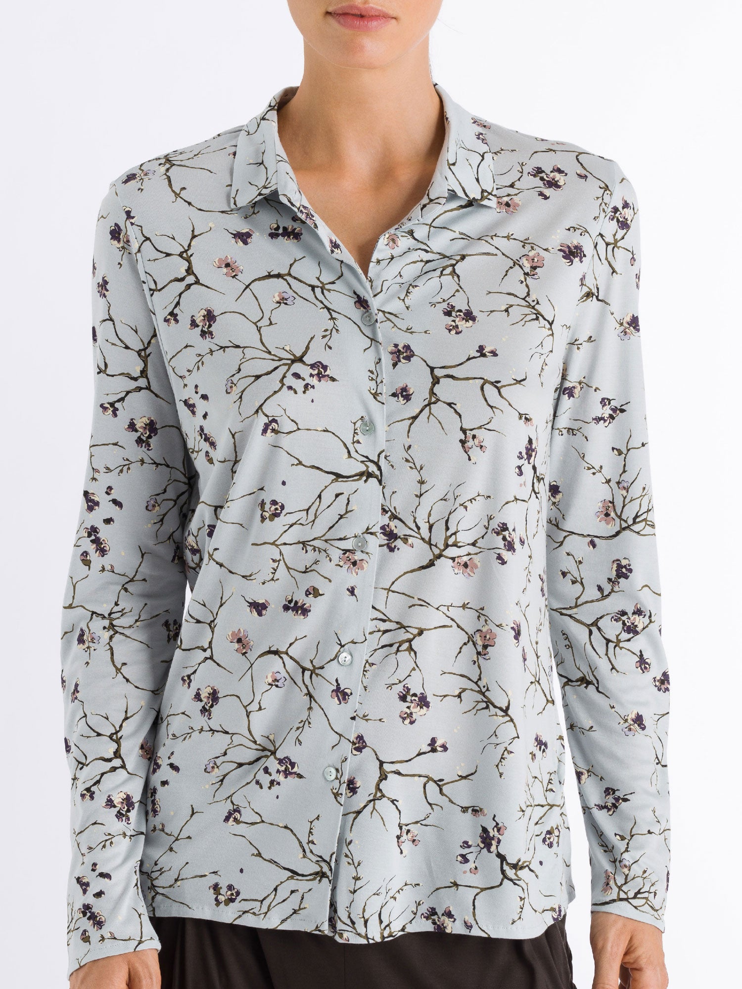Bequemes, leicht glänzendes Langarmshirt aus Mikromodal (Buchenholz-Zellulose) in Blusenoptik mit Kragen; durchgehend geknöpft, mit floralem Blütenmuster.