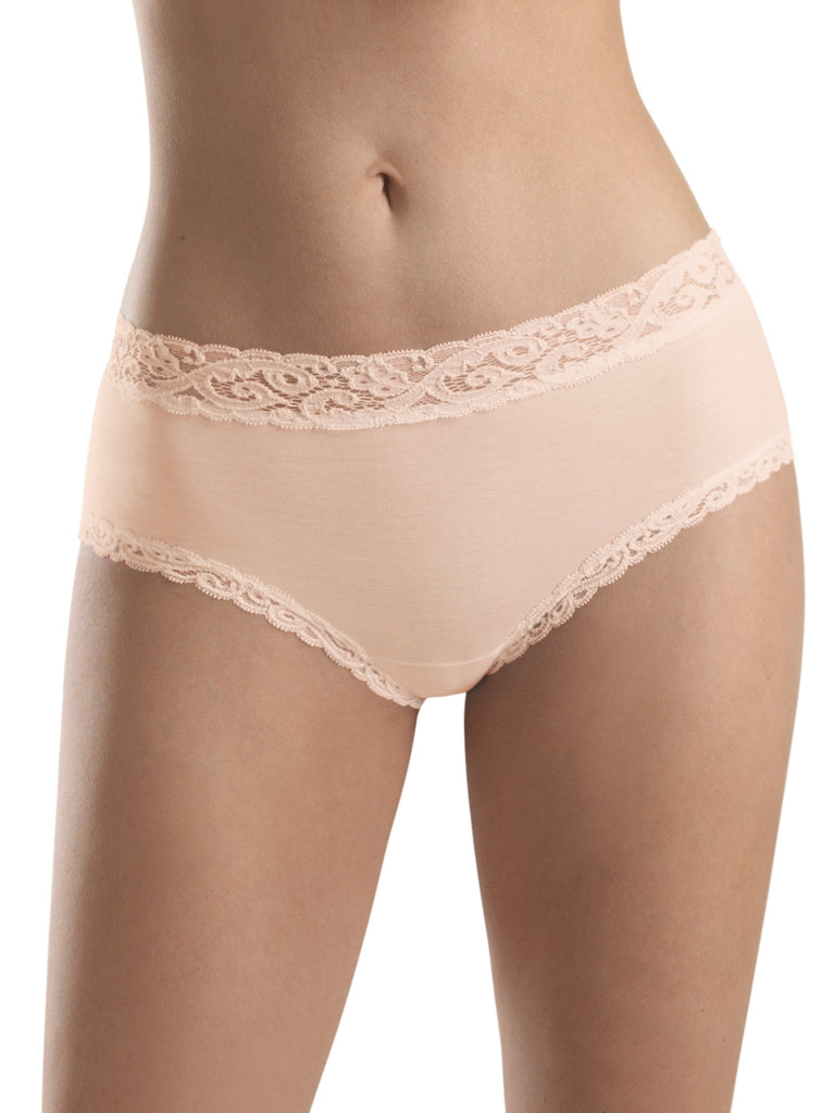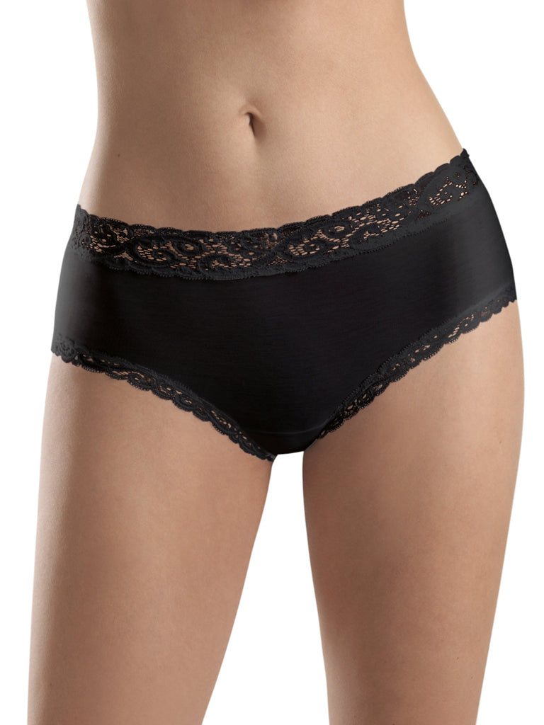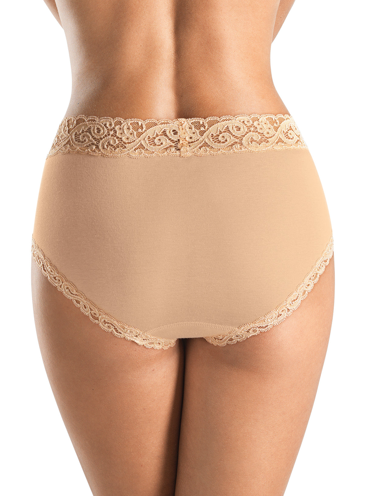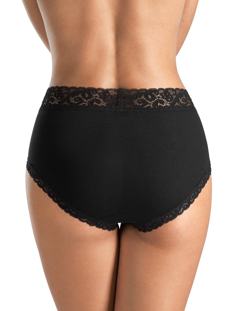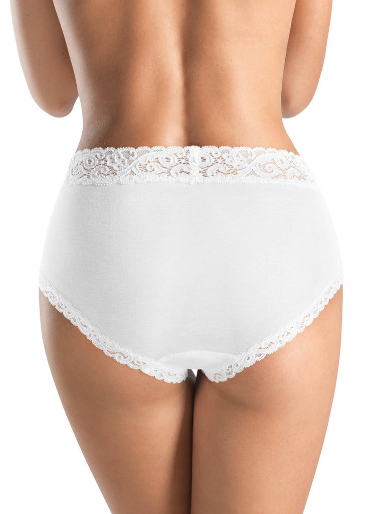 Dieser hochgeschnittene Maxi Slip vereint luxuriöse, seidenweiche Baumwollqualität mit einer raffinierten, elastischen französischen Spitze an Bund und Beinabschlüssen – für eine verführerisch feminine Note. Dank dem Verzicht auf störende Seitennähte bis Grösse L verspricht dieser Slip höchsten Tragekomfort und eine wunderbar schmeichelnde Passform.