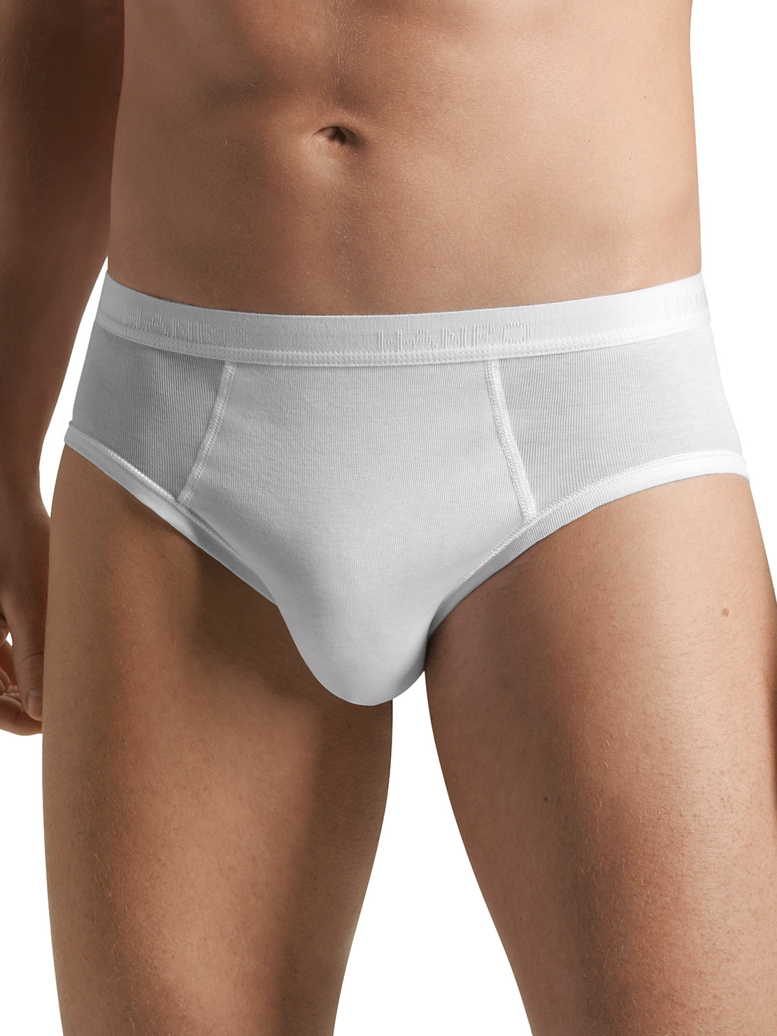 Klassische Tagwäscheserie aus Feinripp in 100% merzerisierter Baumwolle. Maskulin sportliche Schnittführung ohne Seitennähte. Die Unterteile haben einen Gummibund mit HANRO-Schriftzug.