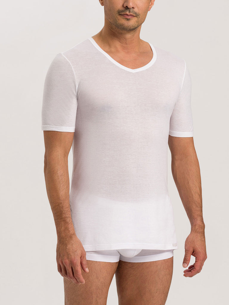 Das T-Shirt aus der leichtesten Baumwolle von HANRO. Länger geschnitten, mit V-Ausschnitt, aus 100% merzerisierter Supima-Baumwolle. Dieses T-Shirt ist superleicht, atmungsaktiv, temperaturregulierend und zeichnet sich durch die hohe Feuchtigkeitsaufnahme aus.