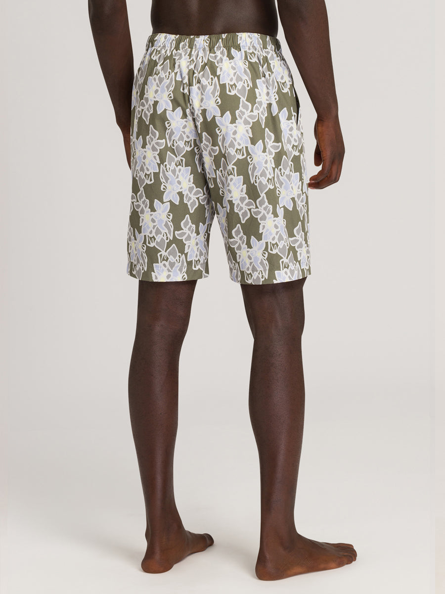 Kurze, bequeme Hose aus feiner, gewobener Baumwolle. Multicolor: Olivgrün mit Hawaiiblumen-Print. Bund mit Zugkordel, 2 seitliche Taschen.