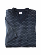 Der bequeme Comfort Fit bietet optimale Bewegungsfreiheit, während der klassische V-Ausschnitt und die praktische Brusttasche dem Zweiteiler eine stilvolle, maskuline Note verleihen. Das verspielte Punktemuster setzt dabei einen dezenten modischen Akzent, ohne aufdringlich zu wirken.