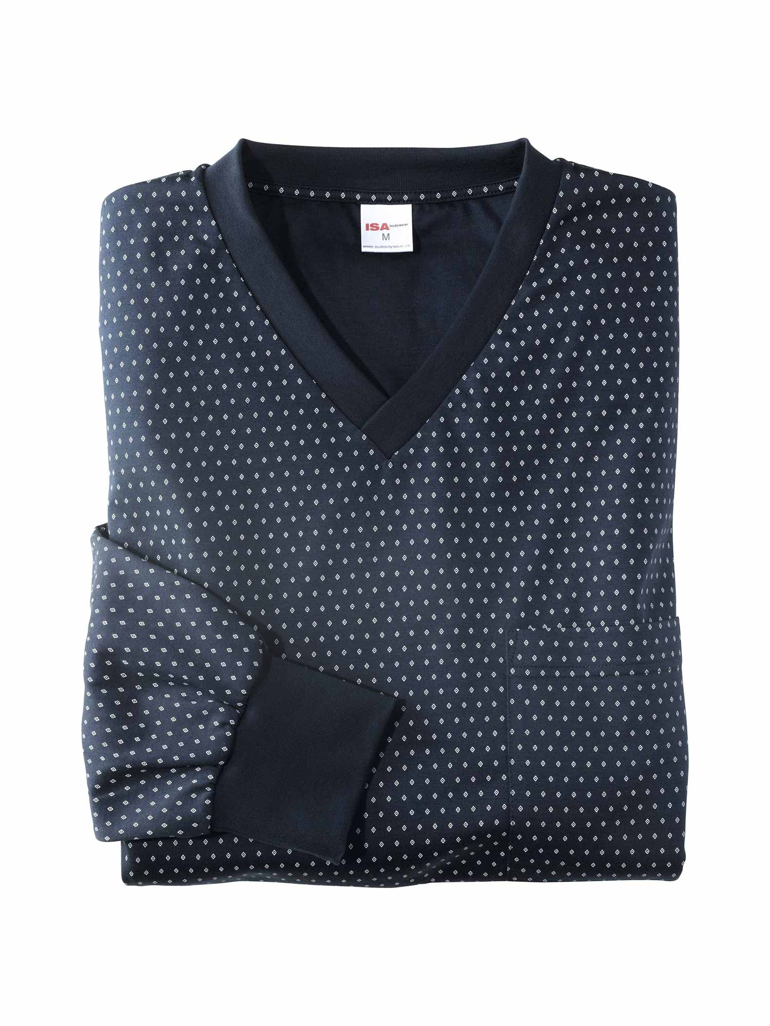 Oberteil gepunktet, Hose uni; Bündchen an Arm- und Beinabschlüssen; aufgesetzte Brusttasche.