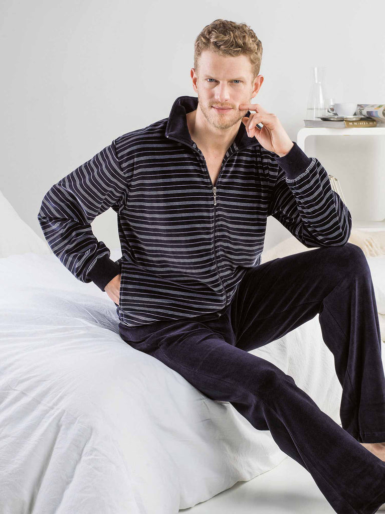 Gemütlichkeit zum Anziehen! Dunkelgrauer Homedress in Nicki Velours Qualität für entspannte Stunden. Das legere Oberteil ist mit Armbündchen, einem Rollkragen und durchgehendem Reissverschluss ausgestattet. Die bequeme Loungehose ist uni grau und weist einen Bindebändel vor. Praktische Eingriffstaschen mit Zipper am Ober- und am Unterteil.