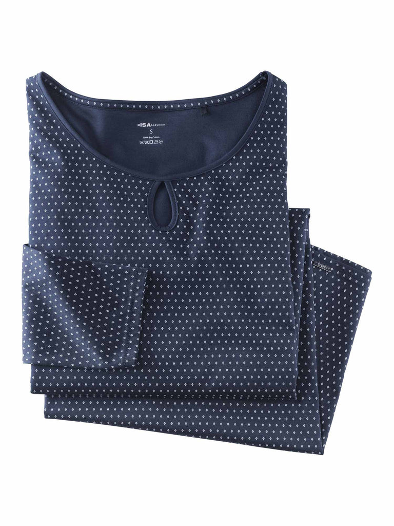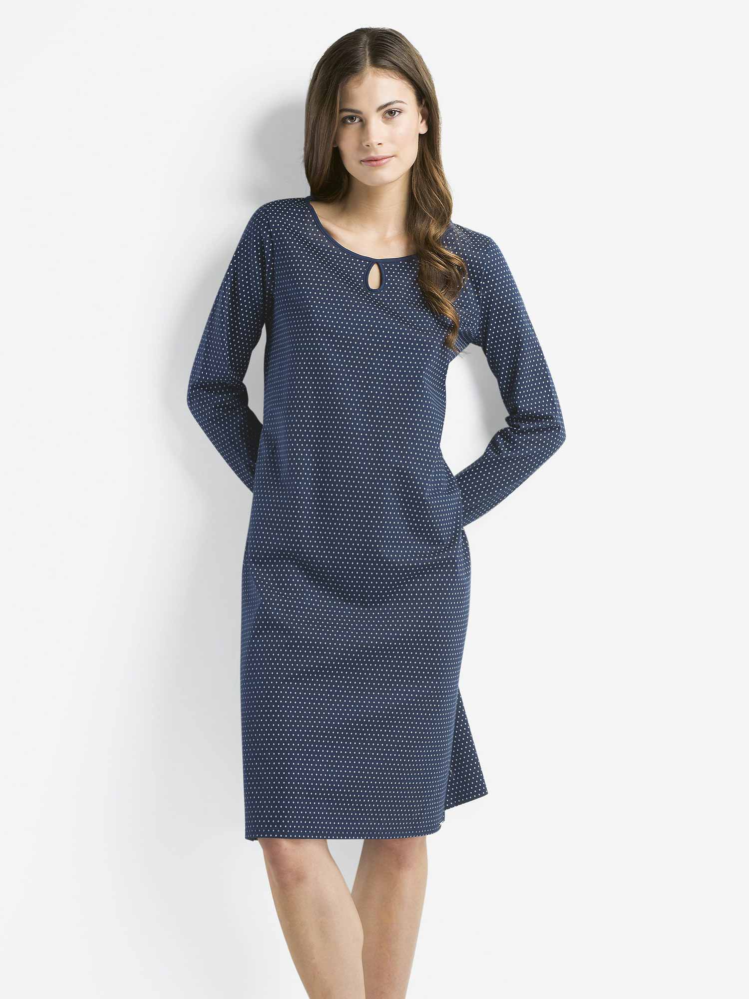 Feminines, langärmliges Nachthemd in dunkelblau mit modischem Allover-Pünktchen-Muster und liebevollen Details wie dem Rundhals-Ausschnitt mit frechem Akzent. Der locker fliessende Schnitt und die weiche Qualität sorgen für perfekten Komfort und versprechen gemütliche Stunden und erholsamen Schlaf. Ihr neues Lieblingsstück für traumhaft schöne Nächte! Länge: 110cm.