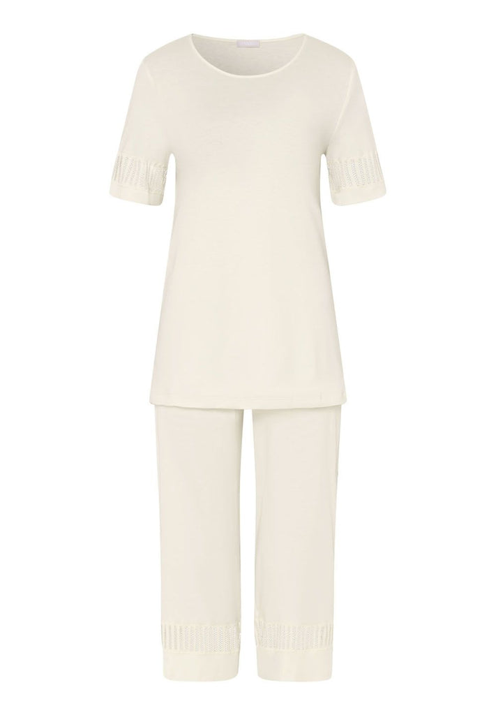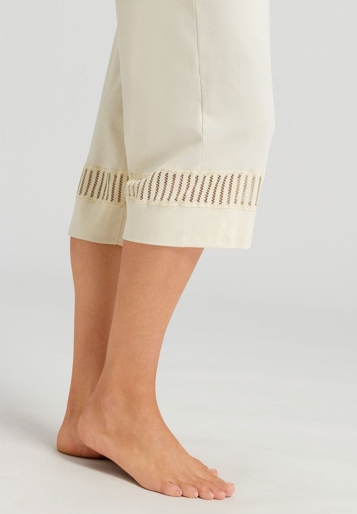 Citron-gelbes, bequemes Pyjama aus merzerisierter Baumwolle mit leichtem Glanz. Dekorative Spitzeneinsätze an den Ärmeln und den Beinen der 3/4-Hose – mit eingefasstem Gummibund.