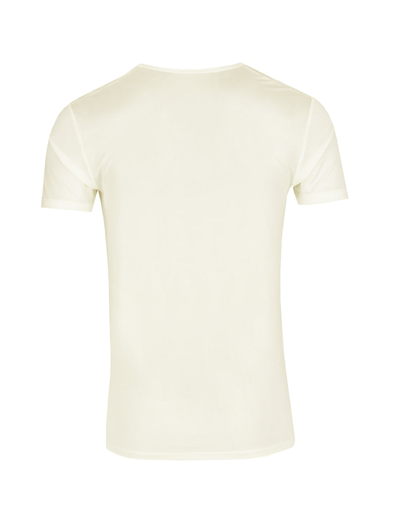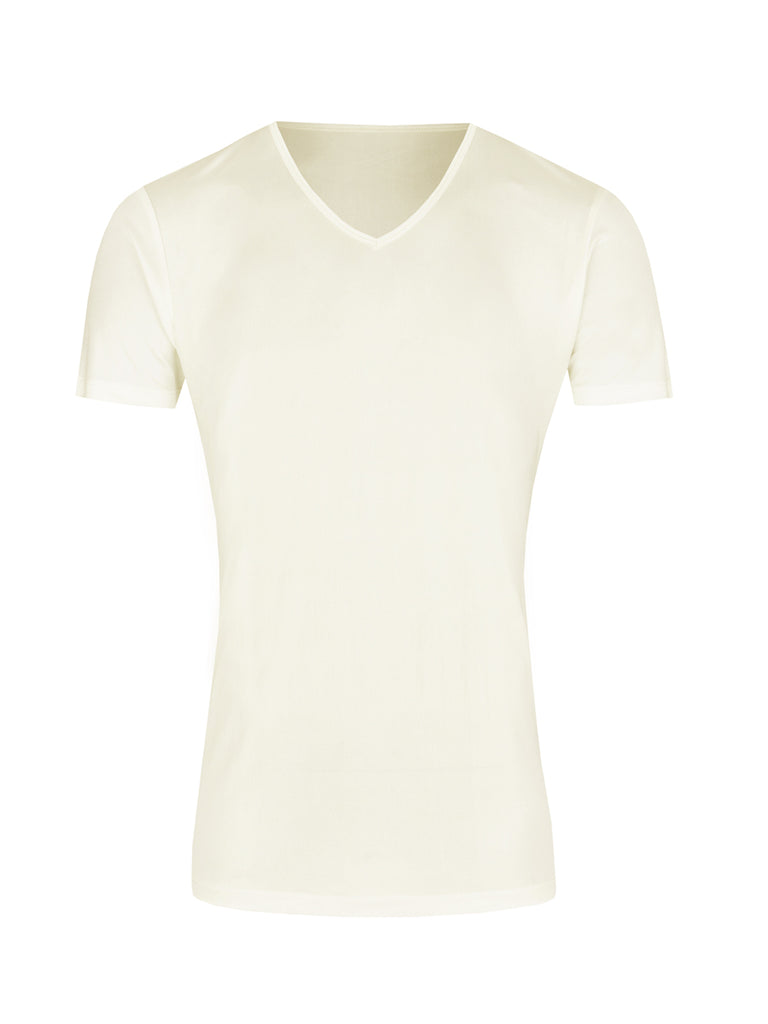 Schön verarbeitetes T-Shirt aus edler, feinmaschiger und dehnbarer Bio-Seide. Klassischer, bequemer Schnitt mit tiefem V-Halsausschnitt – ideal zum Tragen unter dem Hemd.