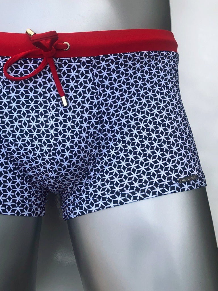Marineblaue Badehose mit kleinen, weissen Seesternen als Designprint. Eingefasster dunkelroter Gummibund mit Kordel; Frontbereich doppelt unterlegt. Optimale Passform dank den drei Nähten im Frontbereich.