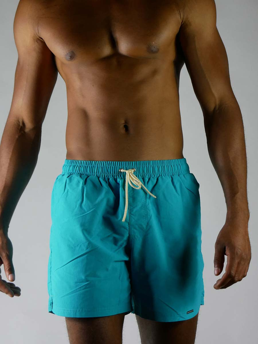 Frische Badeshorts mit Innenfutter. Zwei Seitentaschen und praktische kleine Innenasche für Münzen oder Schlüssel. Eingefasster Gummibund mit Naturkordel für perfekten Sitz. Schnell trocknend.