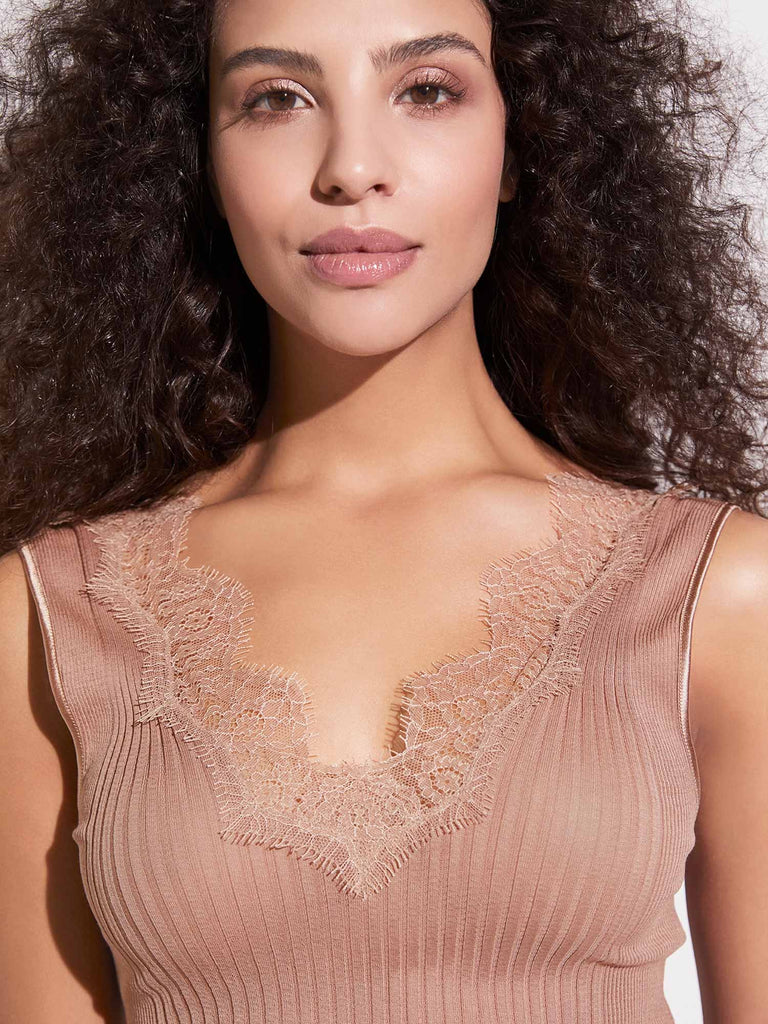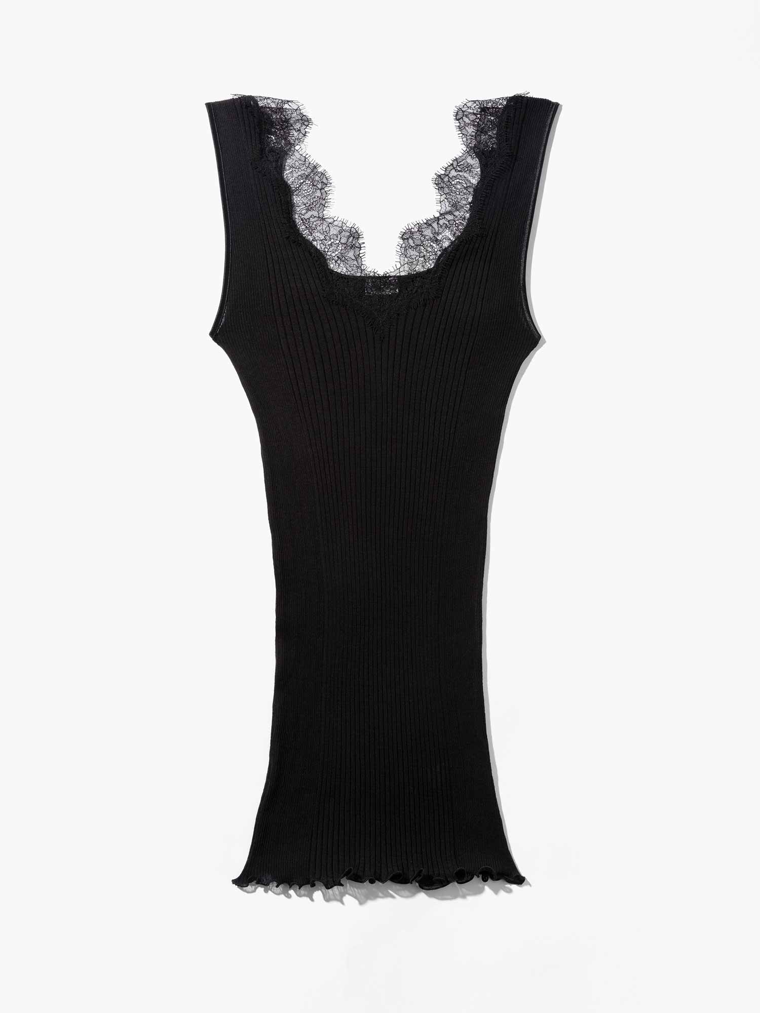 Elegant und verführerisch zugleich! Dieses zauberhafte Tanktop aus dem unvergleichlich dünnen Richelieu-Feinrippstoff begeistert bis nach Hollywood. Gestrickt und genäht in der Schweiz und in Handarbeit mit zarter Eye-Lash-Spitze ausgeschmückt, ist jedes Stück ein luxuriöses Unikat.