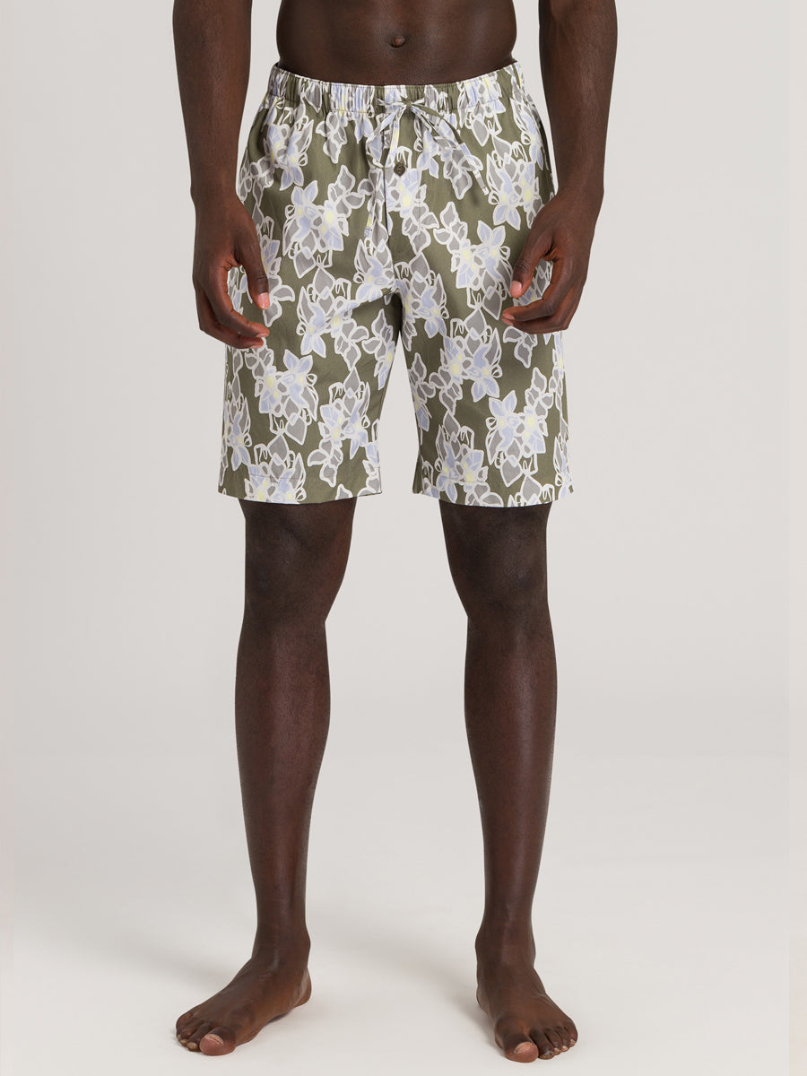 短款、舒适的裤子,由细腻的棉织物制成。多色:橄榄绿色配夏威夷花卉印花。腰带带抽绳,2个侧袋。