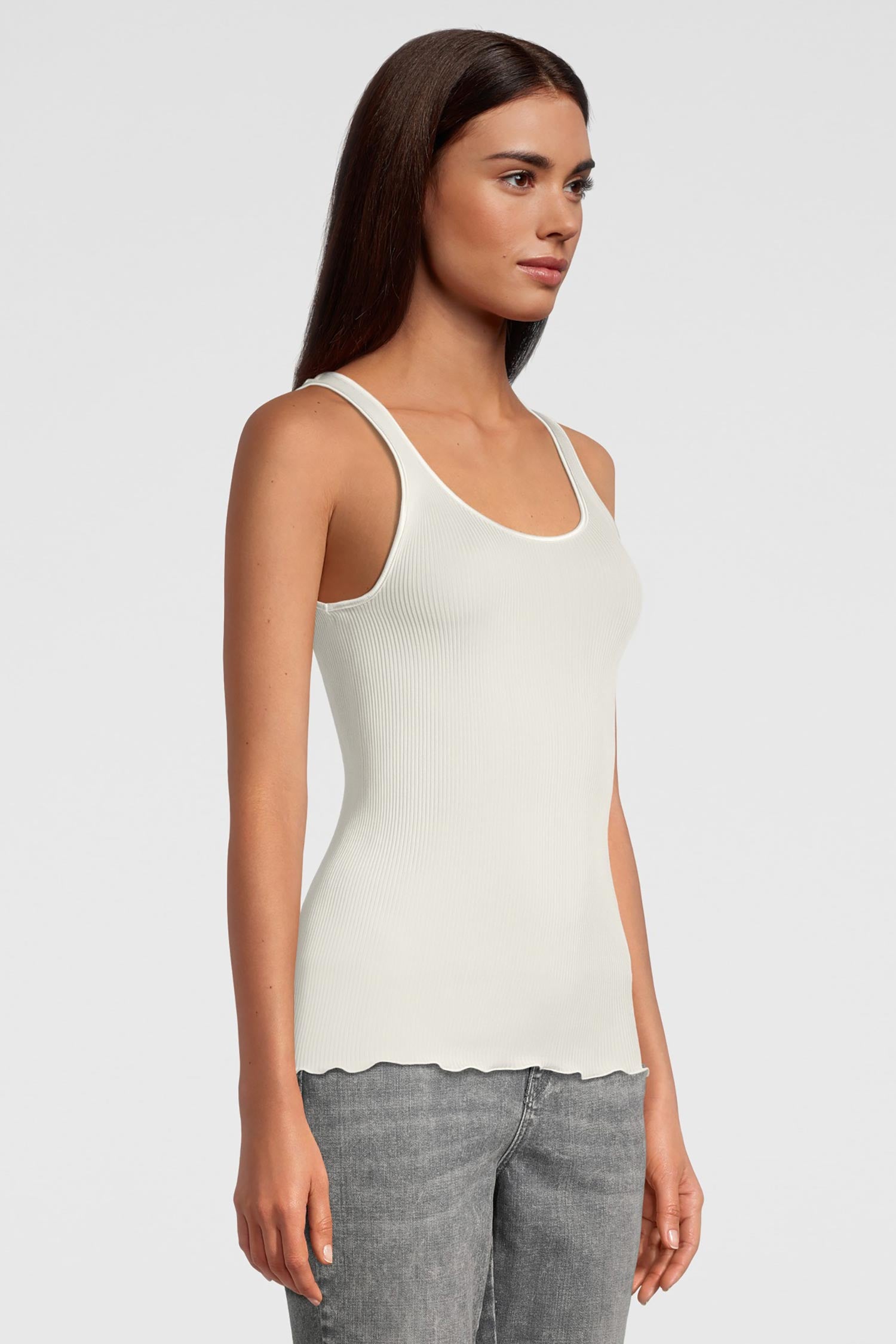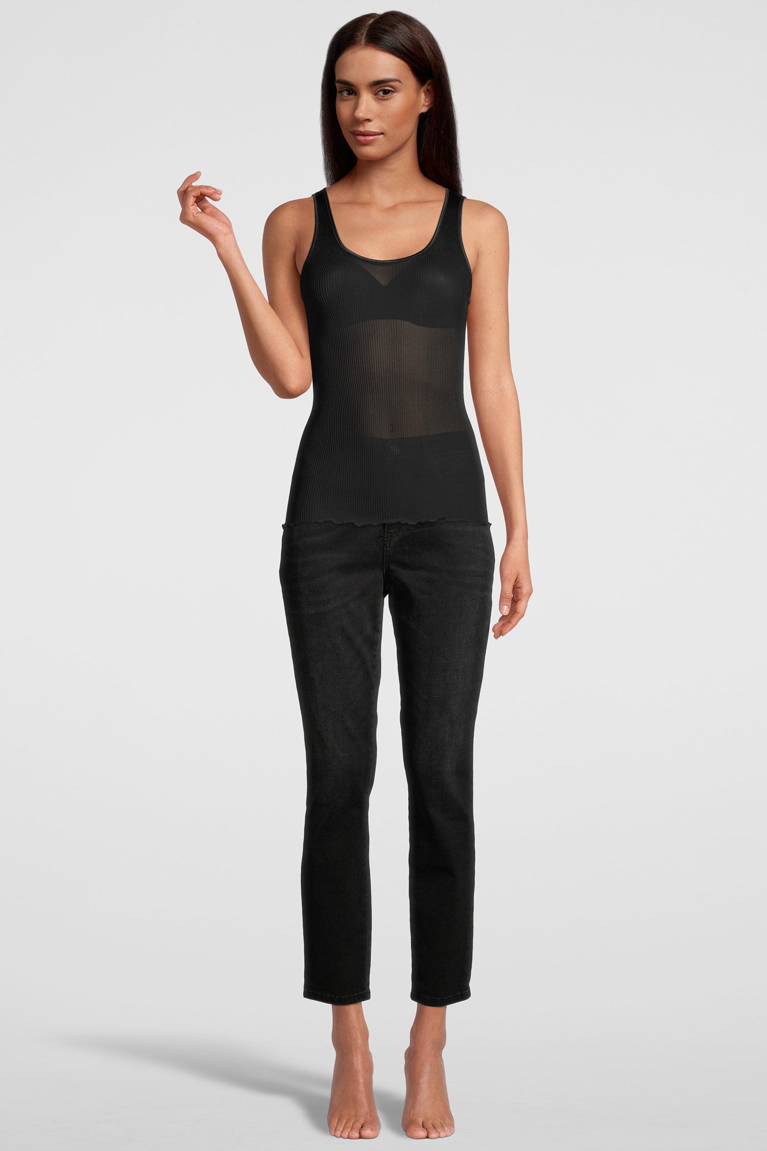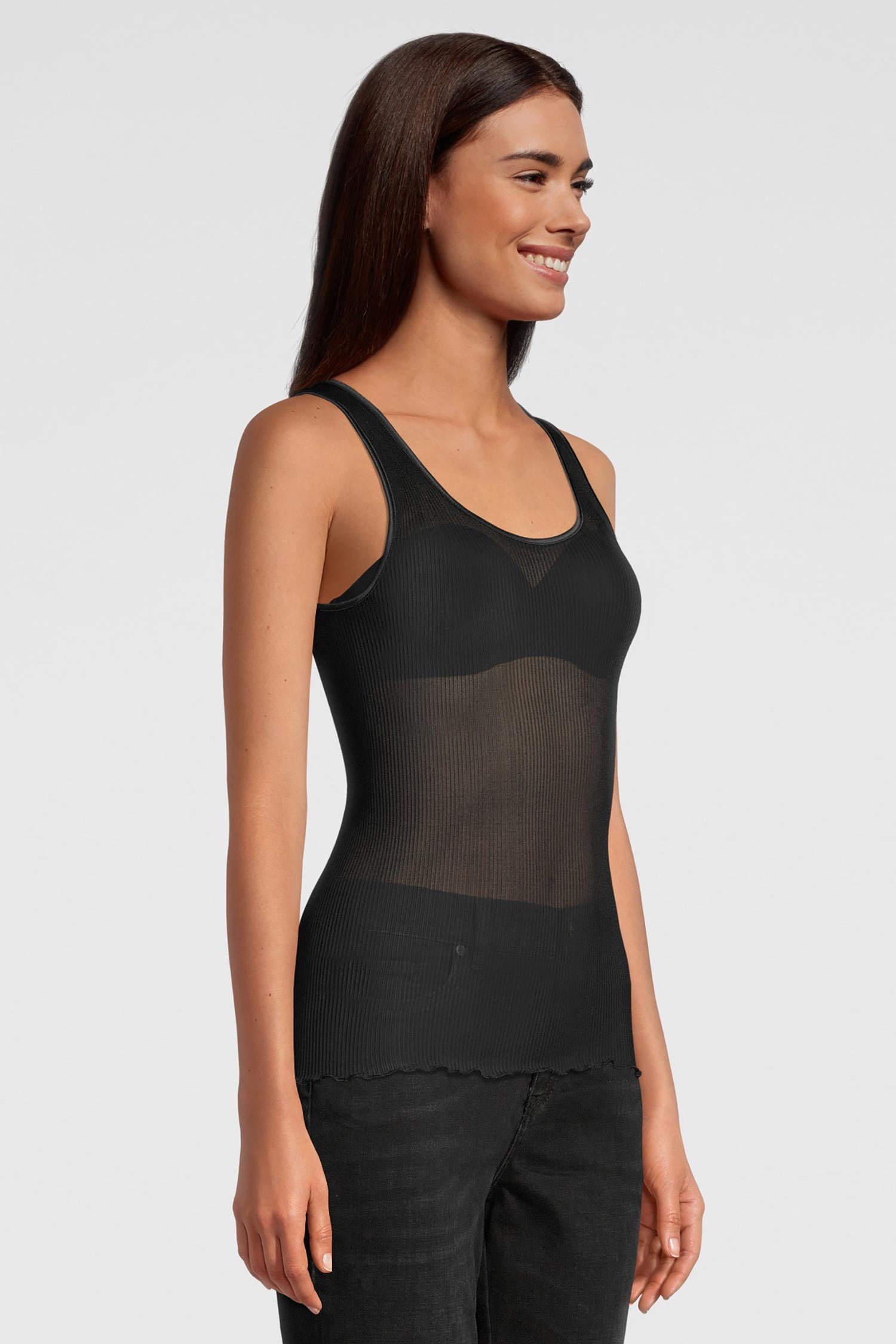 这款顶部凭借其略显透明的外观和略微波浪形的下摆打动了所有重视特别之处的女士们。为了最大程度的穿着舒适度,这款背心没有烦人的侧缝。理想的内衣,也可以作为漂亮的单件穿着。