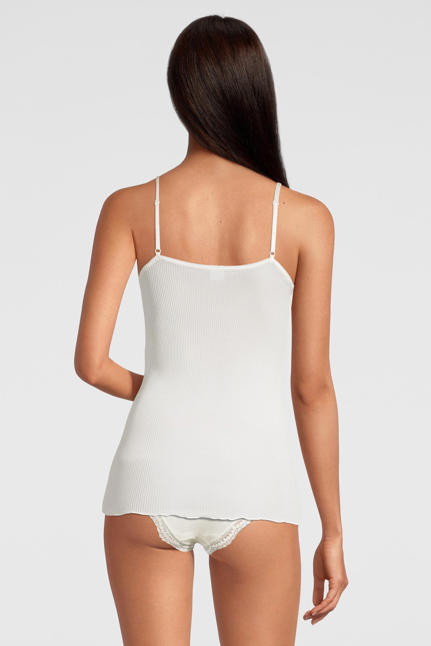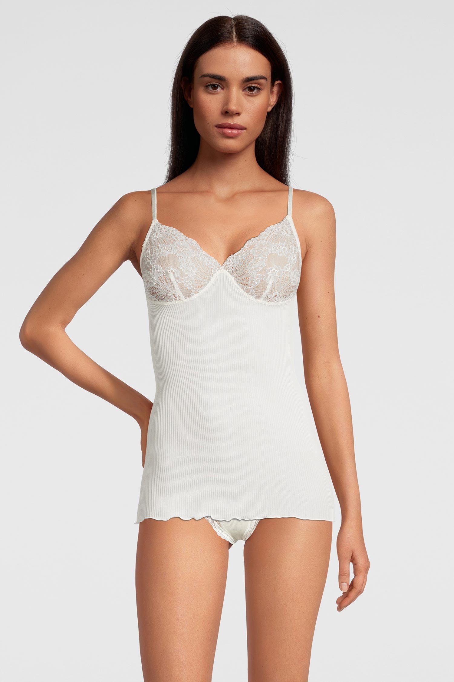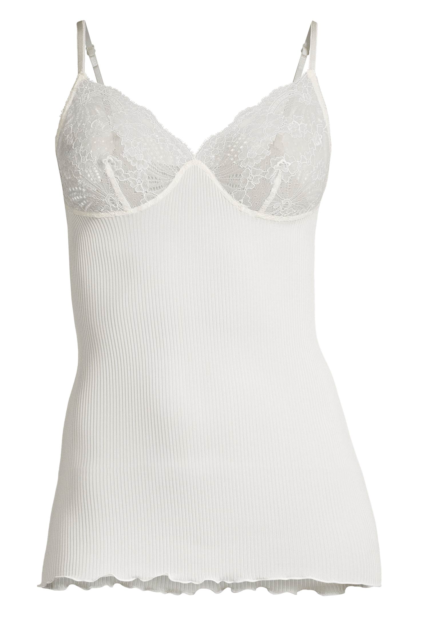 这款感性的斯帕格顶散发出无与伦比的优雅与精致。由纯正、优雅的丝绸制成,采用精细的罗纹欧根纱针织面料,承诺带来纯粹诱惑的气息。来自法国的精致弹性Leaver蕾丝,认证为真正的“Dentelle de Calais®”,装饰着领口,为顶部增添了不可抗拒的女性魅力。