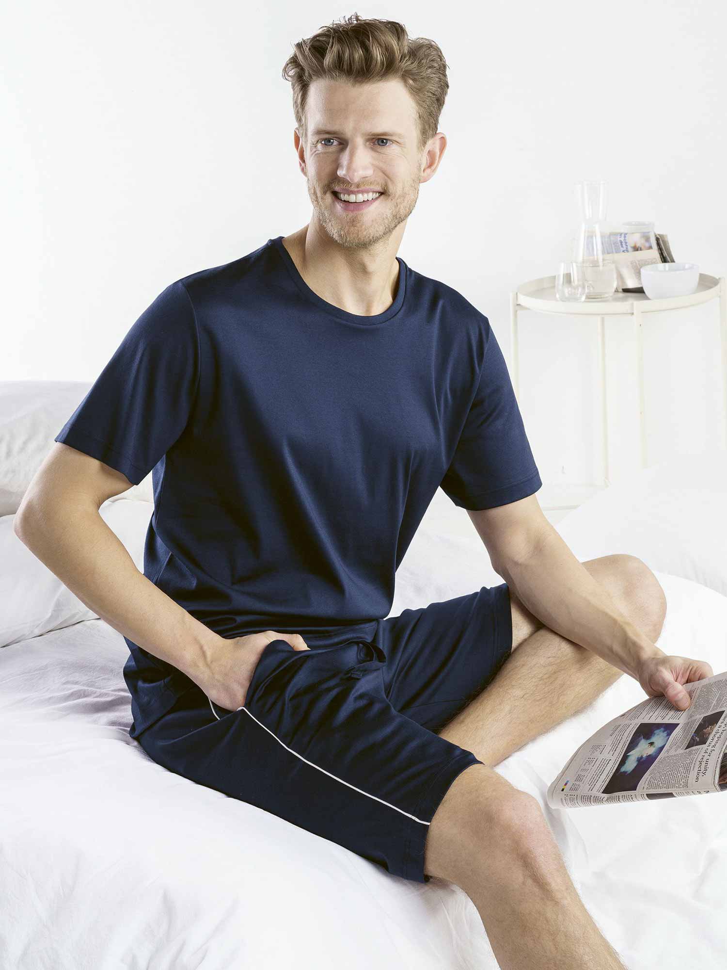 一款由独特材质混合制成的舒适短款睡衣:微模,棉和氨纶。这种混合材料在皮肤上特别光滑,保证了独特的柔软性,并有助于提供一个宁静的睡眠。上衣带有圆领,裤子有侧袋和抽绳。