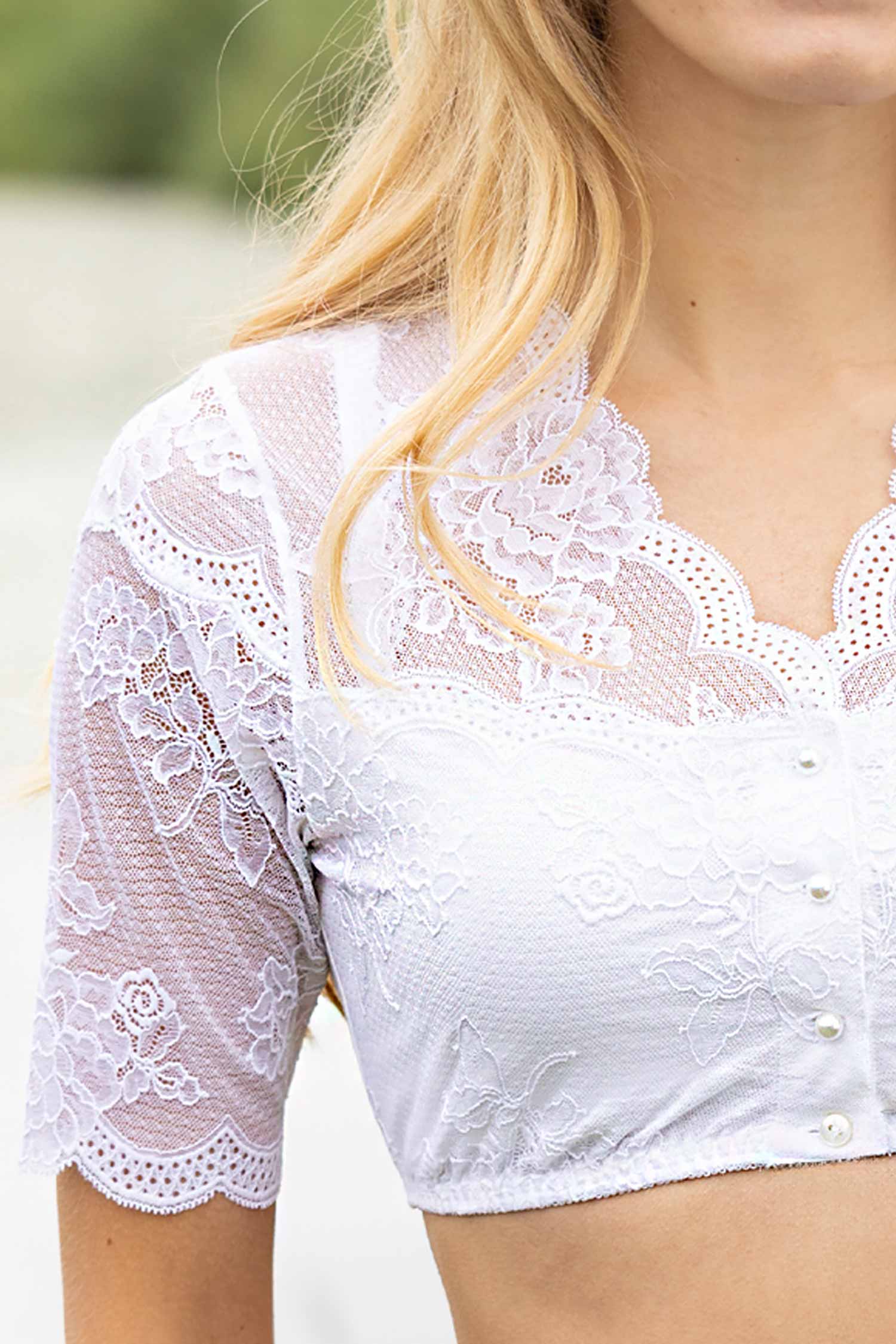 一个充满浪漫细节的小艺术品。花卉图案的精美蕾丝,部分不透明衬底,为Dirndl-上衣 Julia增添了俏皮的轻盈感,而装饰性的边缘优雅地完善了女性化的设计。