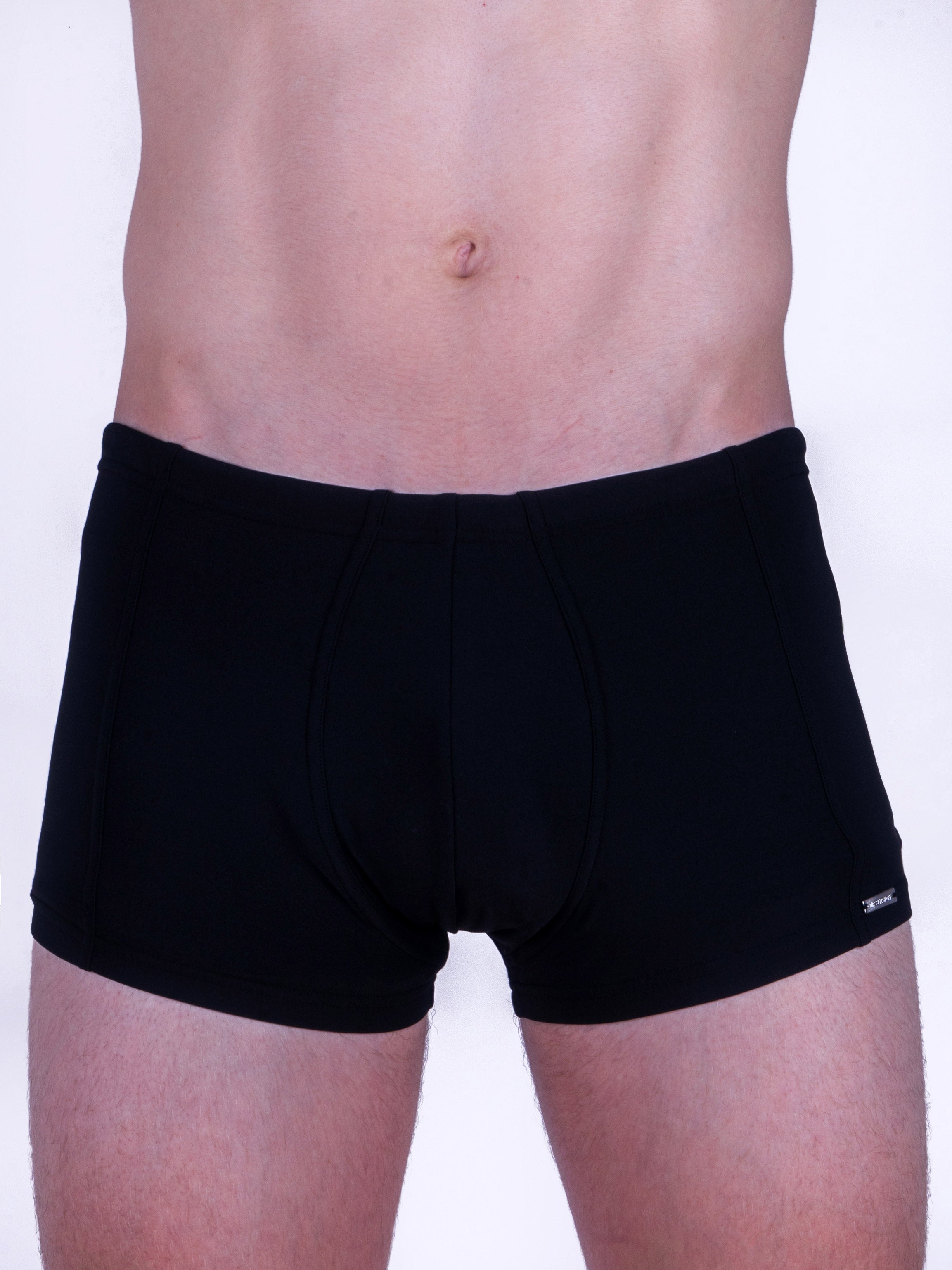 时尚的,纯黑色。紧身泳裤。高贵且低调。由于前部的三条缝线,具有最佳贴合性。内置抽绳的包边橡皮筋。前部内侧双层衬里。