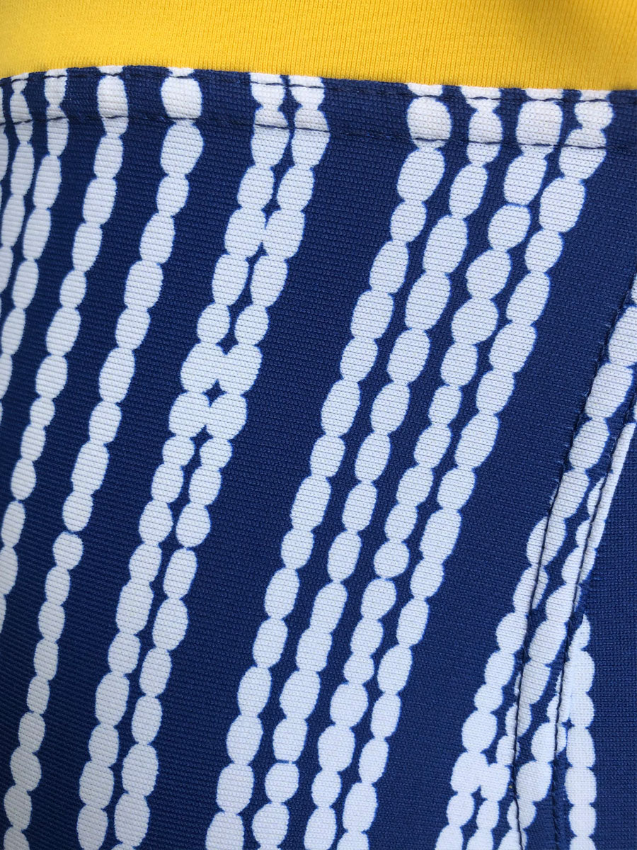蓝色 泳裤 配有白色绳印。包边黄色 橡皮筋 带绳;前部双层衬里。由于前部的三条接缝,提供最佳贴合度。