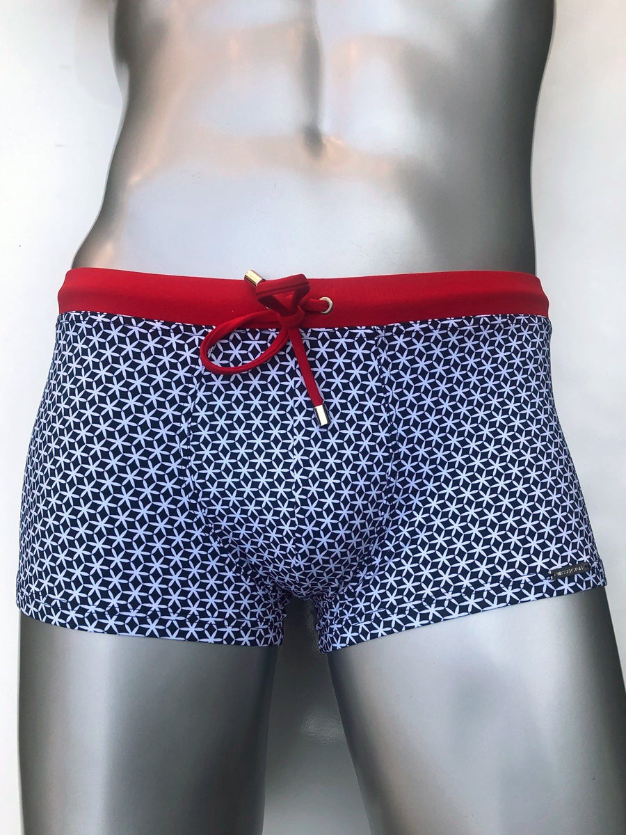 海军蓝 泳裤 设计印有小白色海星。镶嵌的深红色 橡皮筋 带有绳索;前部双层衬里。由于前部的三条缝线,提供最佳贴合度。